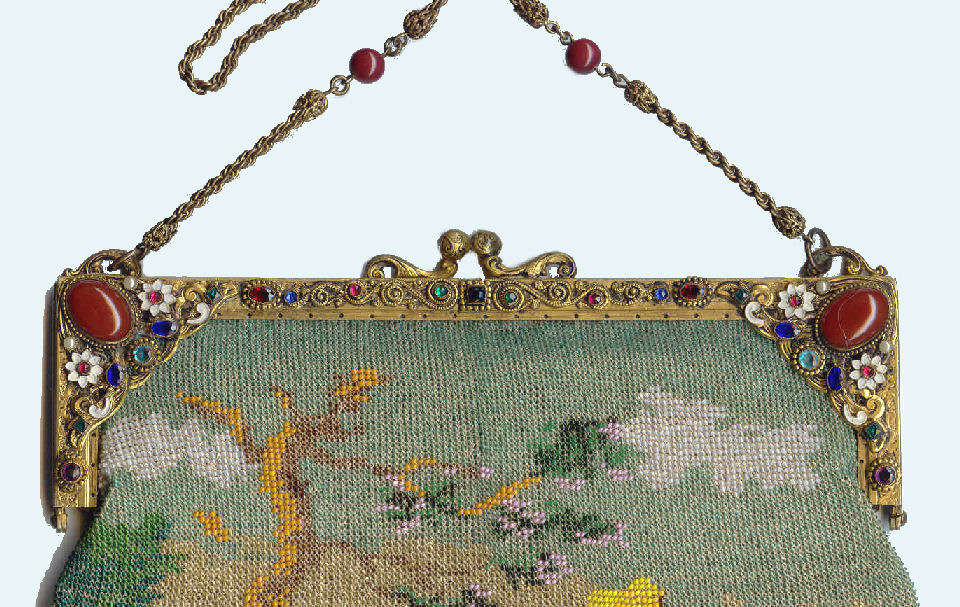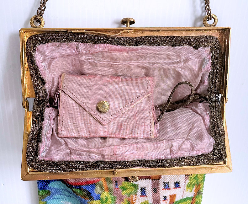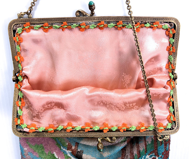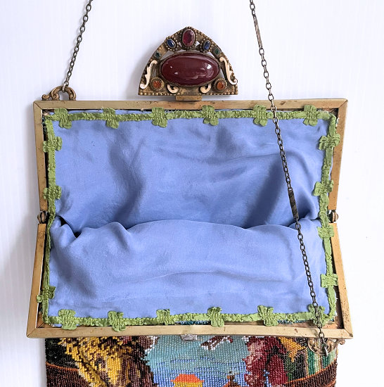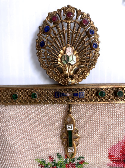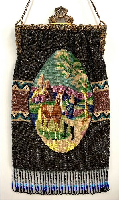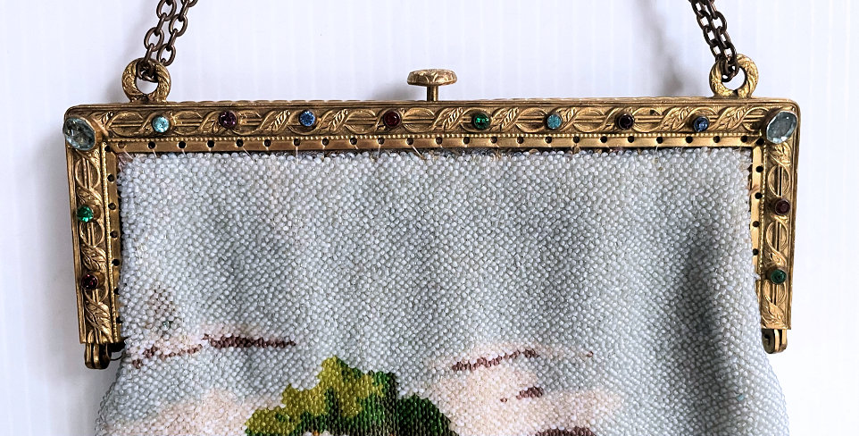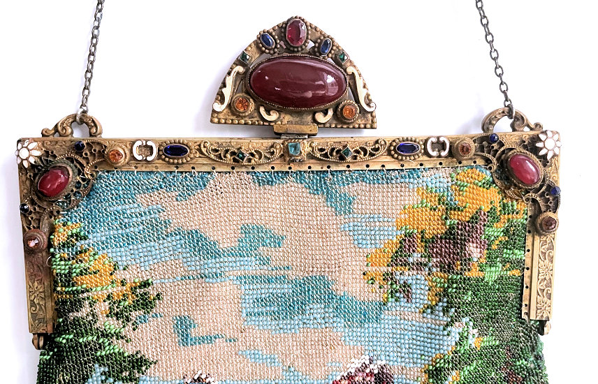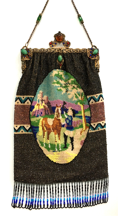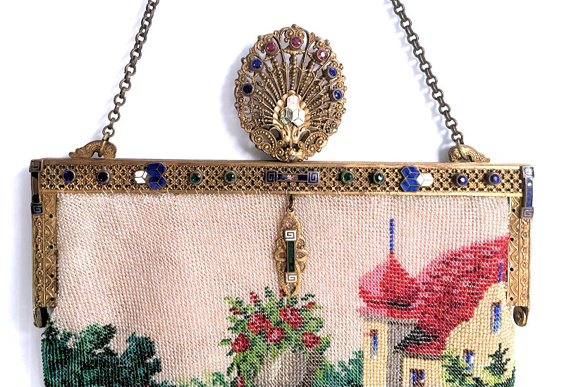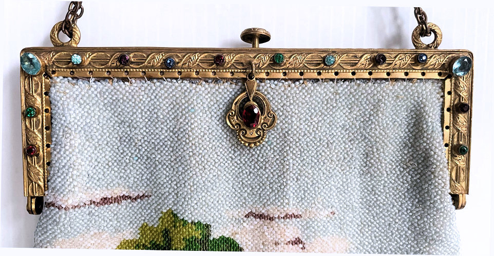 This purse is nothing short of absolutely fantastic featuring a scene so rare that I have never -- in all my 49 years of collecting -- seen before. It is an amazing scene with a stagecoach, driver, and pair of horses with what appears to be a castle on a hill above and a house behind. Just amazing! It is intricately done in the tiniest of beads and has the same scene on the back. The frame is ornately jeweled and enameled and has colors that pick up the colors of the beads. Fringe is intertwined loops that accent the purse. As for condition, there are several areas of repairs that are difficult to see as the scene itself has so much going on. In my opinion, they do not detract from the purse at all and the rarity of the design makes them well worth accepting. I can't say enough about the beauty of this purse! The interior features a new lining in a pretty peach color with French ribbon roses trim. This is a good size purse measuring 7-1/2" wide x 13-1/2" long including the clasp and fringe. (Click on pic for more photos.) |