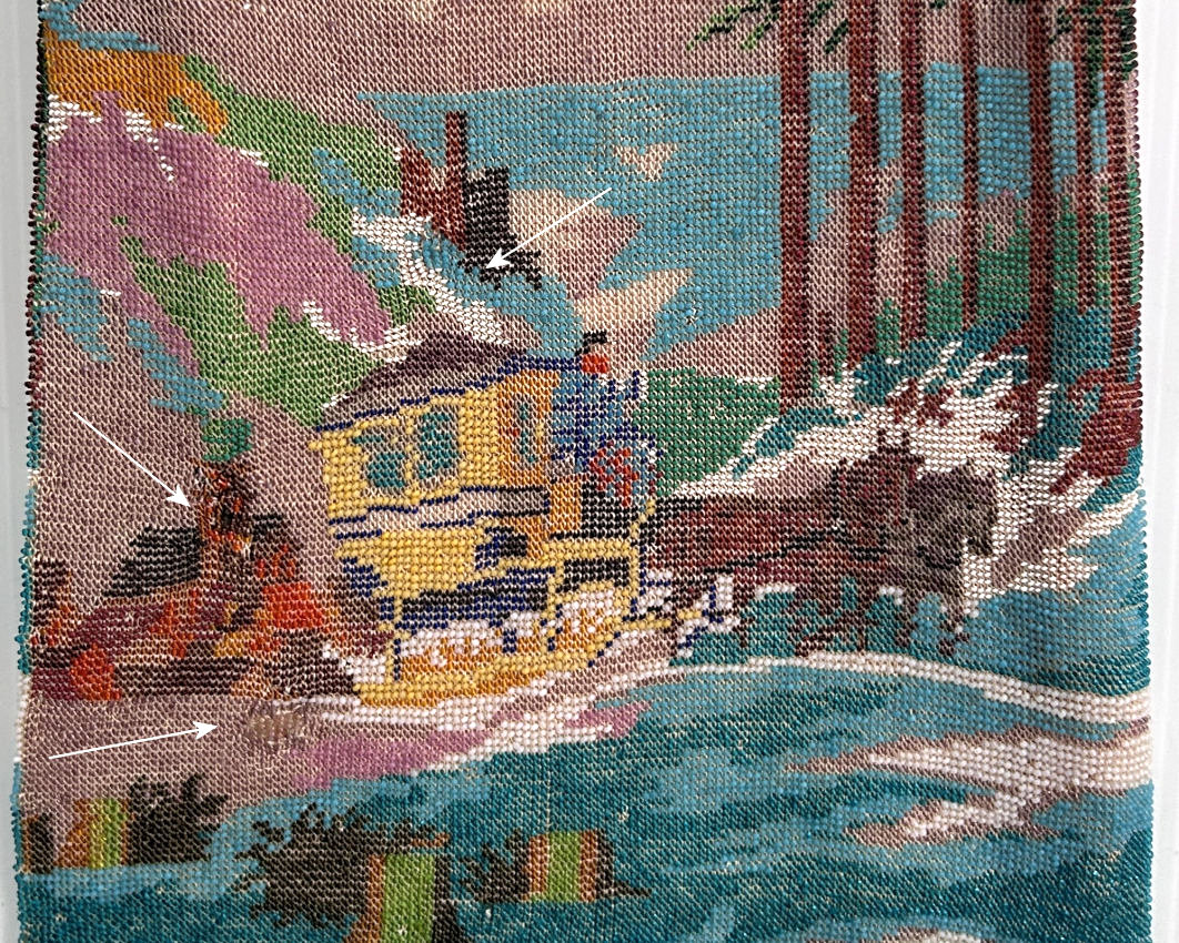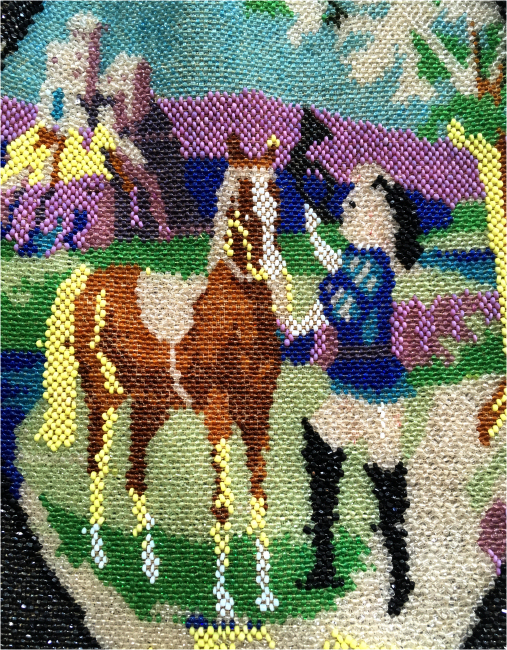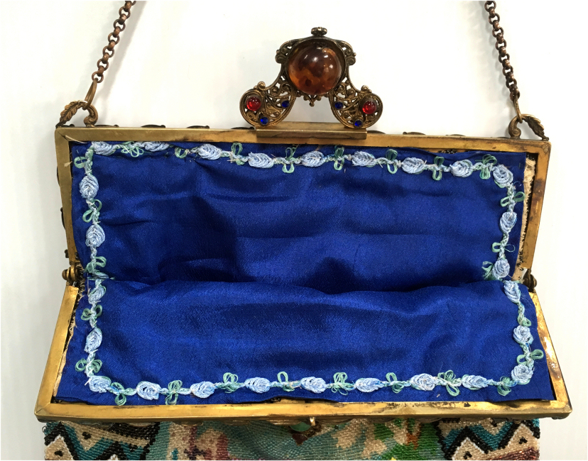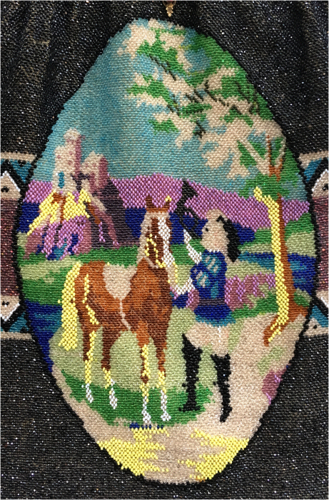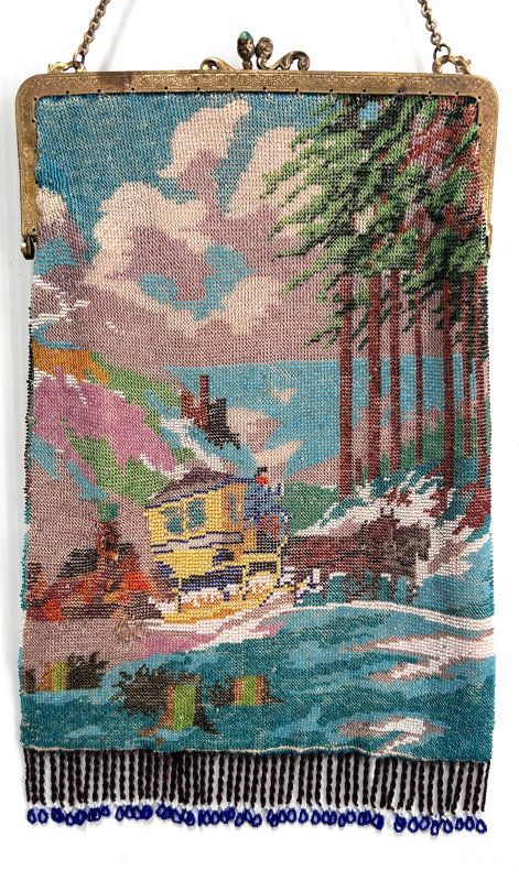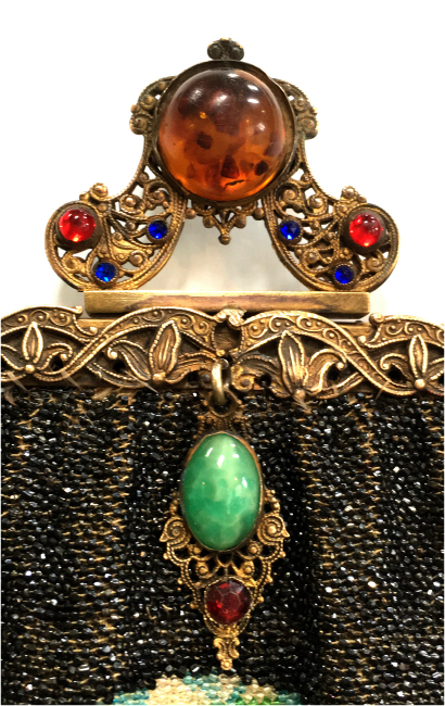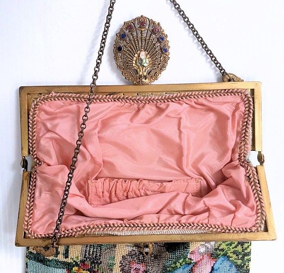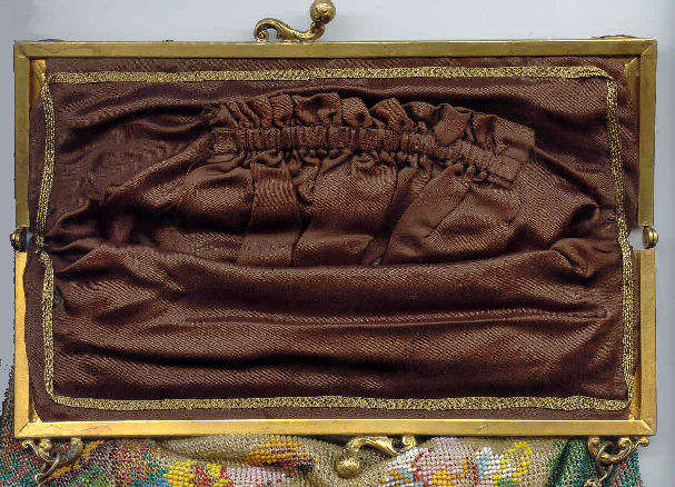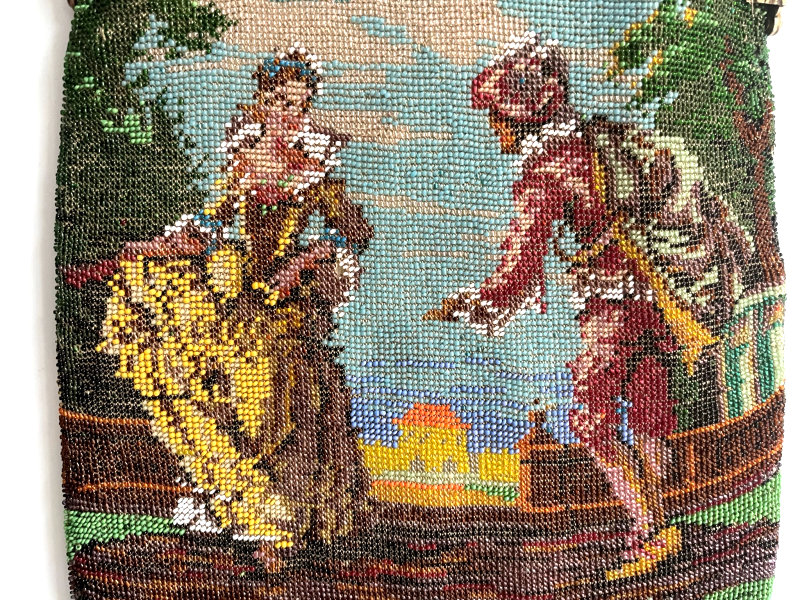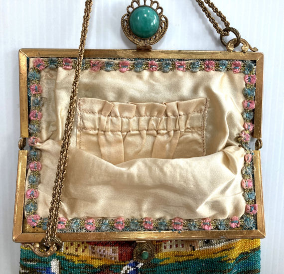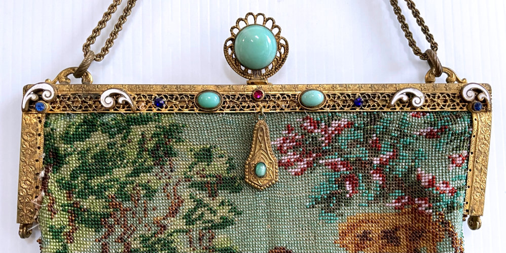 This purse is nothing short of absolutely fantastic featuring a scene so rare that I have never -- in all my 49 years of collecting -- seen before. It is an amazing scene with a stagecoach, driver, and pair of horses with what appears to be a castle on a hill above and a house behind. Just amazing! It is intricately done in the tiniest of beads and has the same scene on the back. The frame is ornately jeweled and enameled and has colors that pick up the colors of the beads. Fringe is intertwined loops that accent the purse. As for condition, there are several areas of repairs that are difficult to see as the scene itself has so much going on. In my opinion, they do not detract from the purse at all and the rarity of the design makes them well worth accepting. I can't say enough about the beauty of this purse! The interior features a new lining in a pretty peach color with French ribbon roses trim. This is a good size purse measuring 7-1/2" wide x 13-1/2" long including the clasp and fringe. (Click on pic for more photos.) |