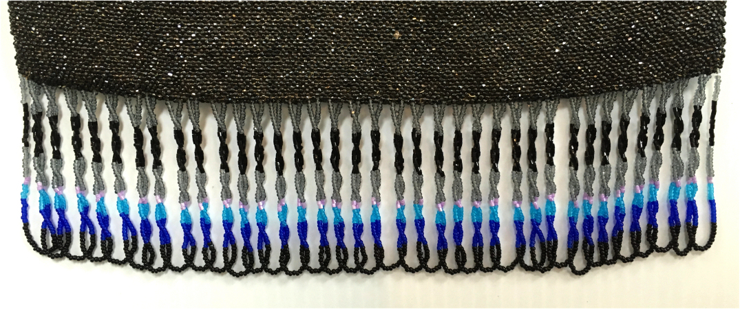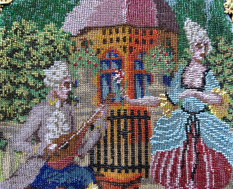This gorgeous micro-beaded purse features a couple outside an estate with an onion dome atop the house. Dressed in their Sunday finest, the gentleman is seated on a fancy bench and is playing a musical instrument (lute or mandolin) while his lady dances alongside. The detail is stunning and so intricately done that it looks like a painting. It is in absolutely perfect condition with no bead loss or damage anywhere that I can see. The frame is spectacular boasting jewels and enameled flowers on the frame as well as the 1-3/4" high filigreed crown jeweled clasp. All stones are present and accounted for. The fringe is a lovely intertwined looping fringe in matching colors to the purse. The interior has been newly relined in a pretty blue silk with braided trim. Measures 7-1/2" wide x 13-1/2" long including the clasp and fringe. (Click on pic for more photos.) |