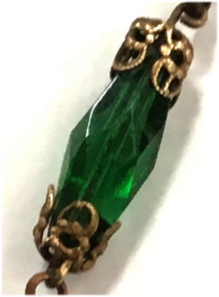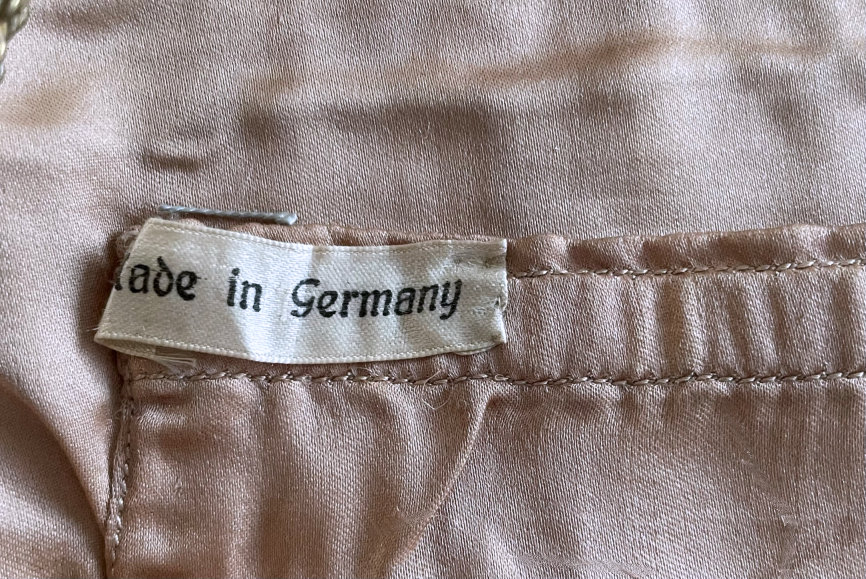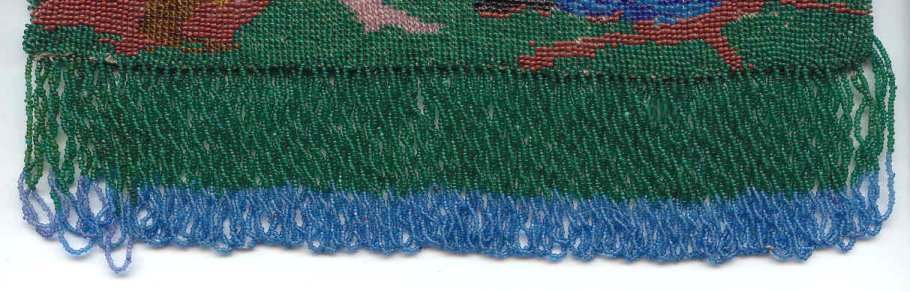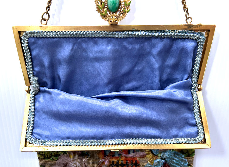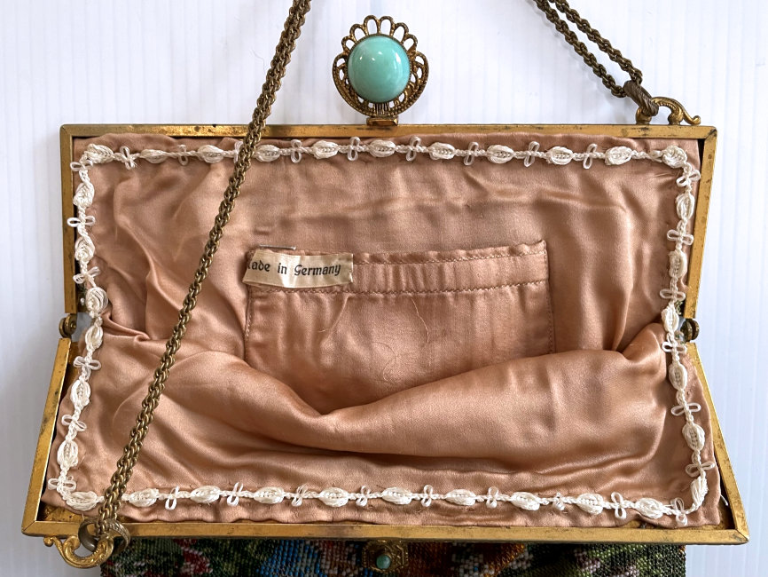 This is a beautiful micro-beaded purse featuring a courting couple in a garden setting with a gazebo in the background and was made in Germany. It has so much detail, especially on the people themselves. They are both dressed in their Sunday finest. The frame is fabulous with four malachite jewels as well as four sapphires and one ruby jewel. White enameled scrolls accent it all the way across. The fringe is done in blue and green from the colors in the purse in intertwined loops. The inside is lined in taupe silk and still bears the original "Made in Germany" label with a little ruched pocket. Overall it is in perfect condition with no missing beads or damage that I can see anywhere. This is a fairly large purse measuring 8" wide x 14" long including the clasp and fringe. (Click on pic for more photos.) |