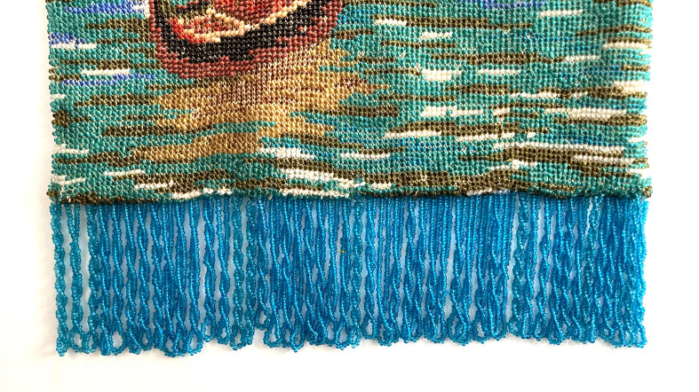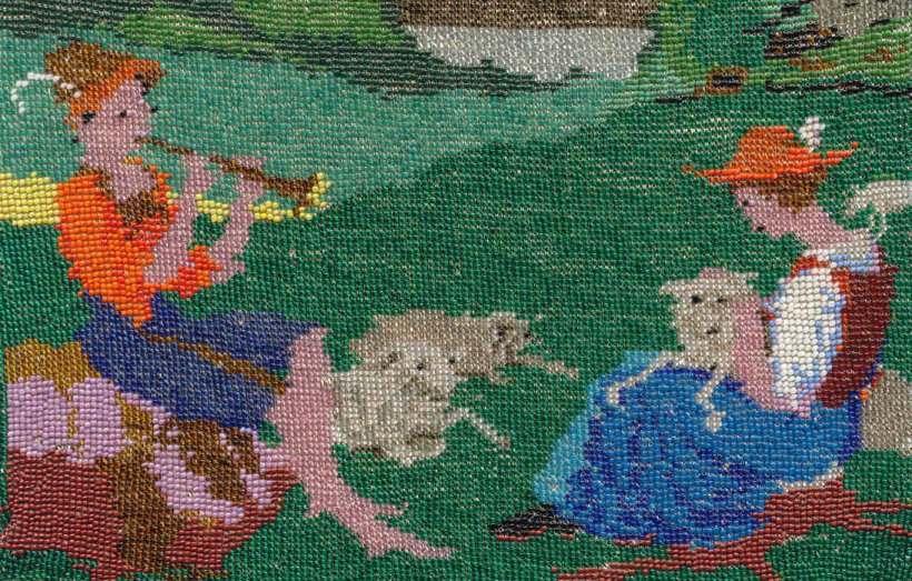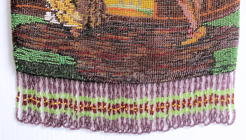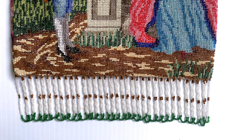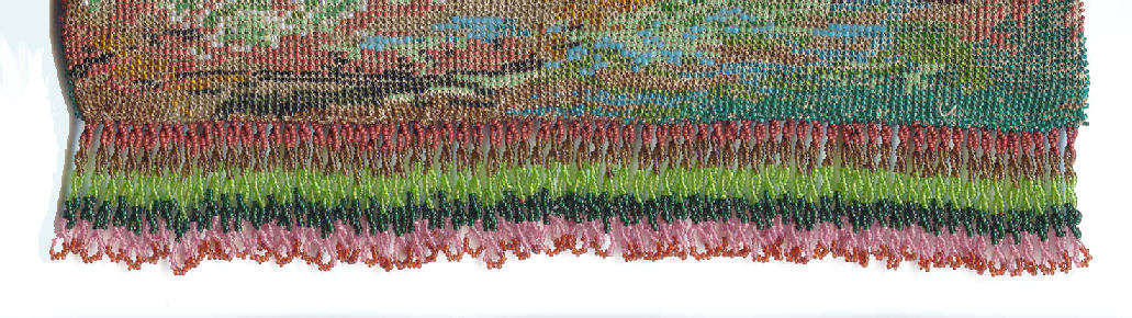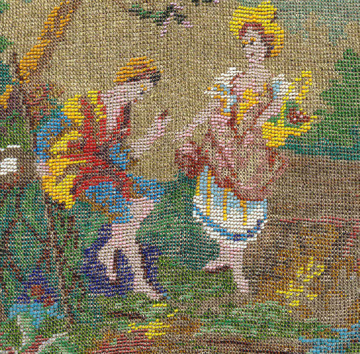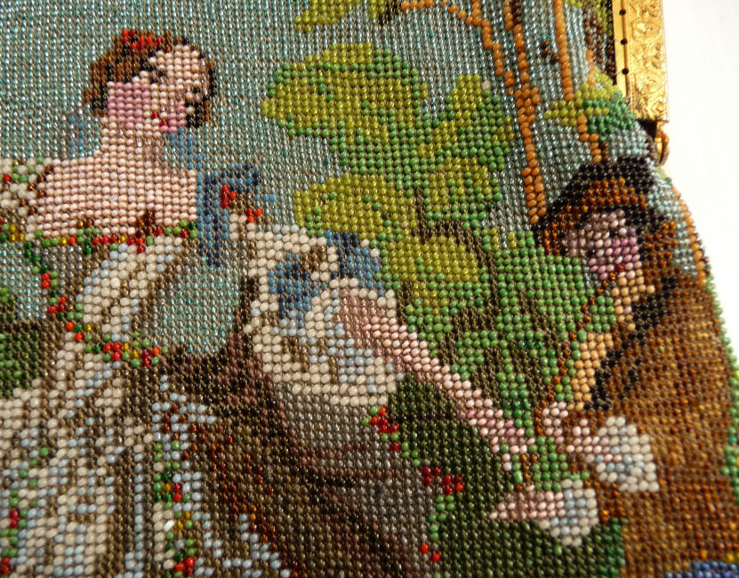This is a stunning figural beaded purse and one of the finest I've ever seen. The beads are so tiny they defy counting ... look like tiny pin spots of color! This is an exceptionally large purse ... the size is 8" wide at the frame and almost 13" long to bottom of fringe. This is one of those purses that leaves tiny areas unbeaded to give contrast and dimension ... this can be seen in the enlarged close-up ... look closely at the girl's skirt. This is not bead loss but rather a method of knitting the purse to deliberately give it depth of design. The colors are all vivid and bright and I can't say enough about it. Look at the intricately twisted fringe that picks up colors from the purse ... just gorgeous! Pictures speak for themselves on this one ... Previously listed at $3,995. (Click on pic for more photos.) |
