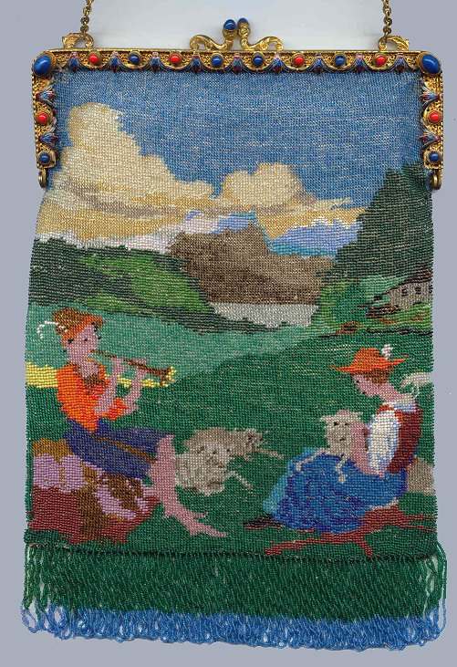 This stunning purse was just acquired from a fellow collector ... it is a country scene featuring the Pied Piper of Hamlin with his flute, several animals, and a lady with her dog. The frame is one of the prettiest I have seen with alternating blue and red stones and jewel-toned enameling draping between them. Matching blue jewels set off the clasp. Interior is lined in pale peach silk with matching braided trim. The lush, thick fringe is done in green and blue tightly twisted interlocking beaded loops. This beautiful purse is in mint condition to my eye ... not a single thing wrong! Measures 7-7/8" wide x 11-3/4" long. Previously listed at $3,500. (Click on pic for more photos.) |
