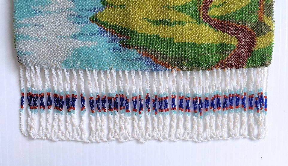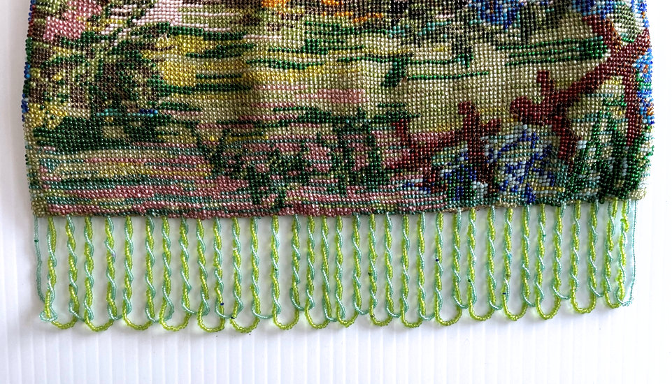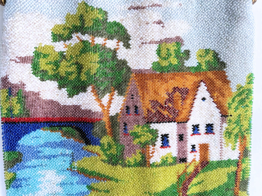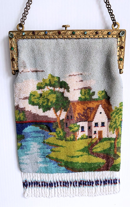 This beautiful beaded purse depicts a tranquil scene of a country cottage beside a river with an arched bridge behind it. The purse is in fantastic condition and boasts a DOUBLE-SIDED jeweled frame with 29 jewels in every color imaginable including a large ruby in the drop pendant. There was no fringe on this one when I got it so I had a professional restorer do a fantastic fringe with some very rare antique robin's egg blue beads which I'm told were extremely difficult to get. The fringe on this one alone cost a small fortune but I think it was well worth it as it makes the design really pop. All of the beads used in the fringe are vintage so it enhances the purse tremendously. I think sometimes the original makers omit the fringe because they are so tedious to do but make all the difference in the world when done properly. The purse retains its original lining with an attached little change purse and a metallic braided trim. Measures 6-1/4" wide at frame x 6-3/4" wide at bottom edge x 11" long from top of clasp to bottom of fringe. (Click on pic for more photos.) |