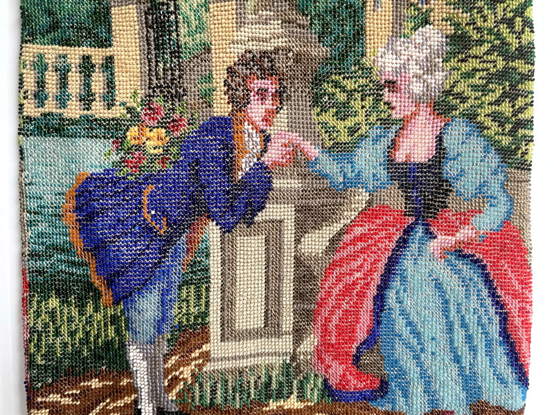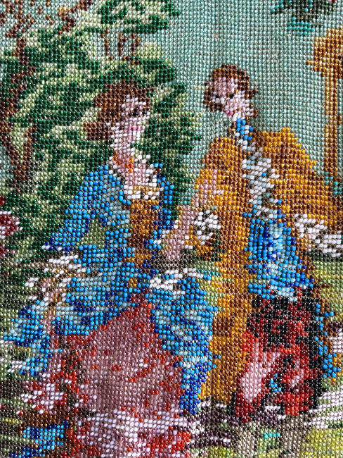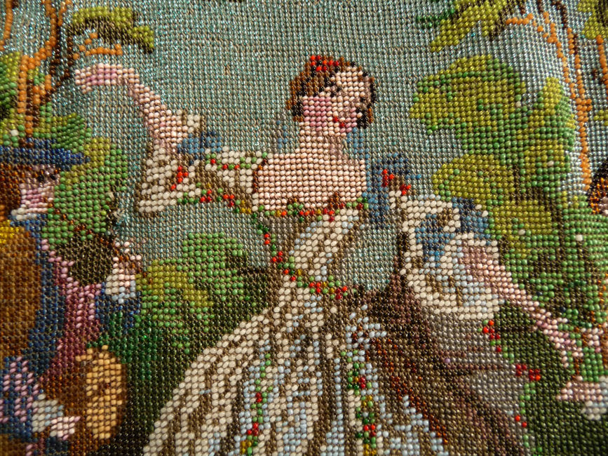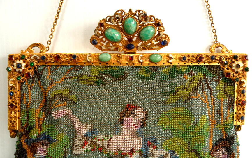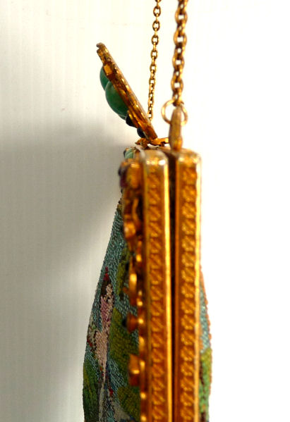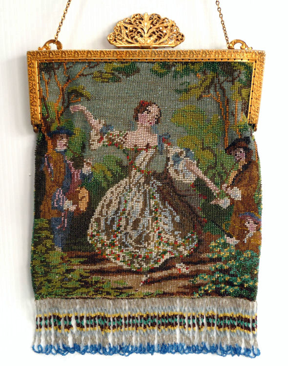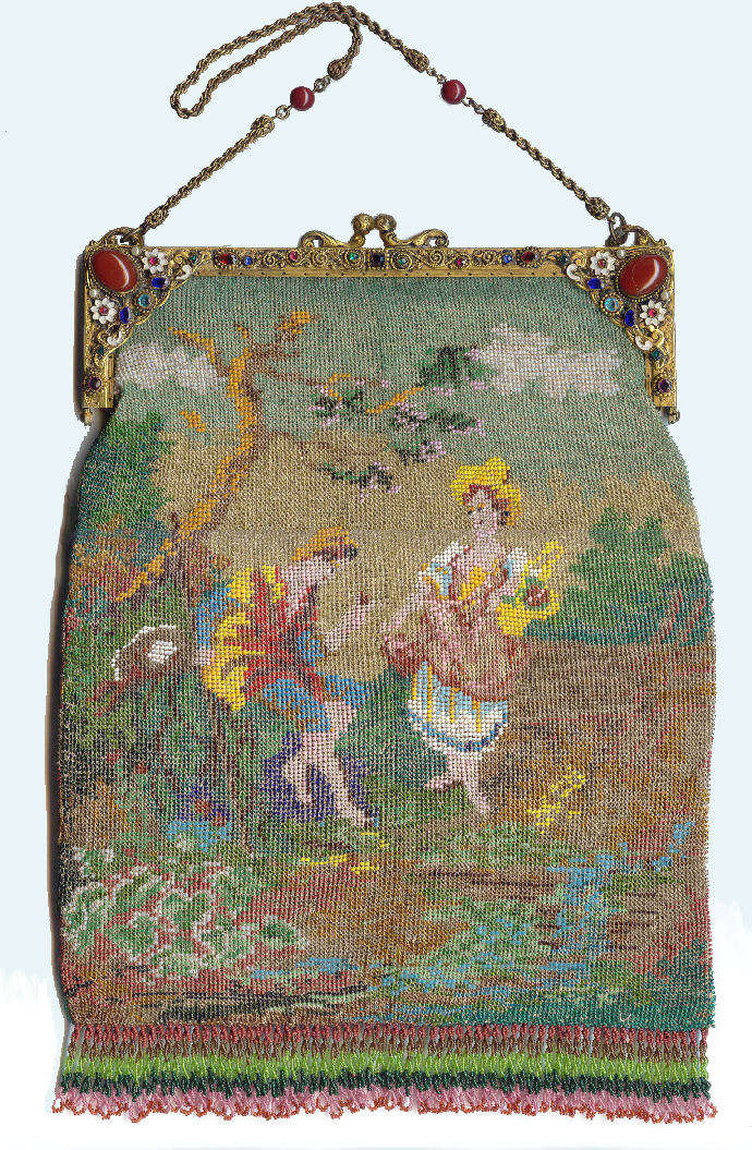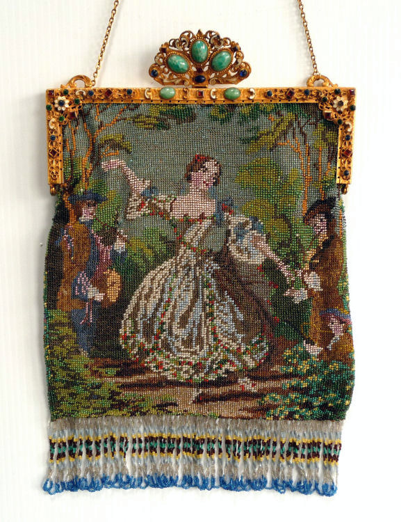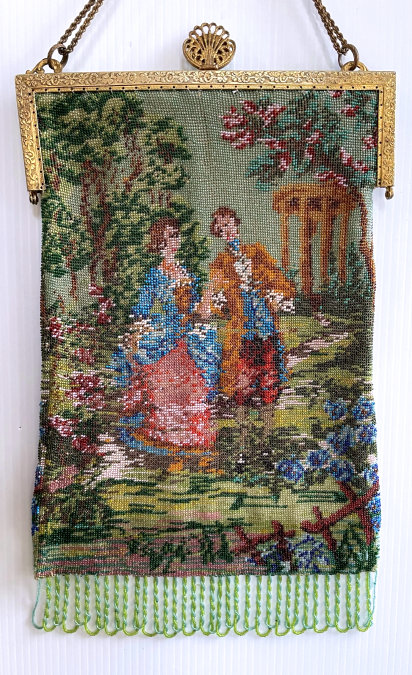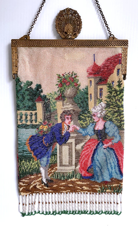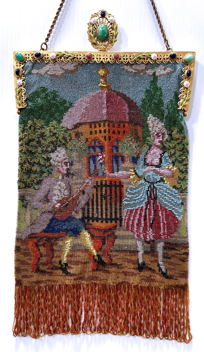 This is a stunning figural beaded purse and one of the finest I've ever seen. The scene is of a couple outside an estate seen in the background behind the walled grounds. The gentleman is dressed in his finest with cape and hat while the lady is in her best gown. He appears to be reaching for her hand. This is a scene I have never come across before and I consider it to be very rare. It is possibly an artist's renditon of Nicolas Lancret's painting "Nicaise" dated 1738. The frame on this one is absolutely stupendous. Jeweled and enameled with a large jeweled crown clasp to set it off. The interior is lined in Wedgwood blue silk with green ribbon trim. And the fringe!!! Beautifully done with twisted interlocking loops with 7 -- count them -- 7 color changes! I just can't say enough about this beauty. Condition is excellent with the only apologies being a few small chips in the left red stone and a wee bit of missing enamel on the clasp (more noticeable in the photos than in person). Beads are all intact and purse is in fantastic condition. Measures 7" wide x 13" long overall. (Click on pic for more photos.) |