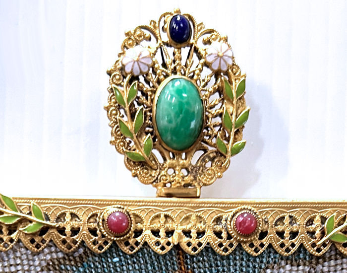 This rare beauty features a lovely scene on the front and back of a horse and rider in full riding outfit complete with boots. There is even a castle atop a mountain in the background! I cannot say enough about the magnificent frame on this one. It has a beautiful filigreed frame set with two large malachite cabochon jewels on each corner and a matching one on the drop pendant. There are small ruby and sapphire jewels surrounding each of the corners and a small ruby under the pendant. The high crown clasp has the same rubies and sapphires surrounding a LARGE amber stone which I believe is genuine amber (not being a gemologist I can't swear to this, but it certainly looks real to me). There are 25 jewels in the frame all together. To top it all off, there are two emerald glass faceted jewels in the chain handle with fancy caps on either end. It is just gorgeous! The inside is newly relined in a deep blue to match the blue in the beads and is finished with a lovely french silk rose trim. The fringe is beautifully done in interlocking twisted beads in the colors of the purse with black, blue, turquoise, lilac, and silver. Condition is excellent with possibly a bead or two missing but I honestly don't see any. The right corner malachite stone has a slight chip on it that I didn't notice until now mainly because it doesn't show up easily and can be felt more than seen. This is a very large purse measuring 7-1/4" wide at the frame x 8-1/4" wide at the bottom x almost 16" long from clasp to fringe. First time offered! (Click on pic for more photos.) |