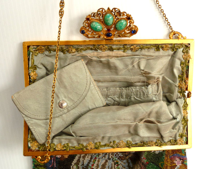 I have had this fabulous purse in my personal collection since 2009 and it is a design I have seen only on compacts; I have never had it on a purse. The scene is taken from a famous painting done by Nicolas Lancret in 1730 entitled "La Camargo Dancing". The frame is one of the most beautiful I have ever seen with it's high "crown" jeweled clasp. There are enameled accents between the gemstones which are in varying shapes and colors. The interior is lined in original green silk with ruched pocket and coin purse ... the lining does have several splits but it is still intact overall. The fringe is lushly done in twisted interlocking loops in the colors of the purse. The beads on the purse are in different sizes and this is done for contrast (see close-ups). The body of the purse is in very good condition overall. As for apologies, there aren't many but I will point out what I know. There is a very early repair done right beneath the lady's elbow on the front left side which will be visible in the close-ups. There is one tiny jewel missing in the center of the enameled daisy on the right top corner. There are some areas of enamel loss in the frame which aren't obvious unless you are looking for them. The clasp when viewed from the side tilts forward at an angle. For whatever reason, this is the way it was made and it looks perfectly fine from the front. The purse is a nice size measuring Measures 7-1/2" wide x almost 12" long from top of clasp to bottom of fringe. First time offered! (Click on pic for more photos.) |