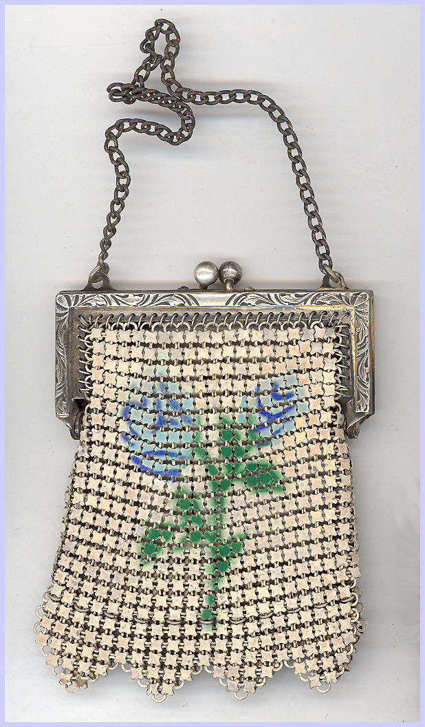 Sweet little Whiting & Davis child's mesh purse with fancy embossed frame. Original W & D metal tag inside. Enamel in great condition with only very minor loss ... a few loose tiles under hinges but all in all in very good condition for a child's mesh purse. Measures 2-1/2" wide x 4" long not counting handle. (Click on pic for more photos.) |