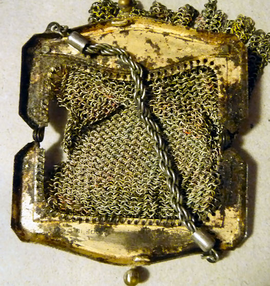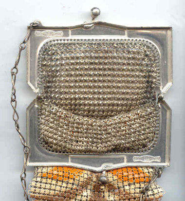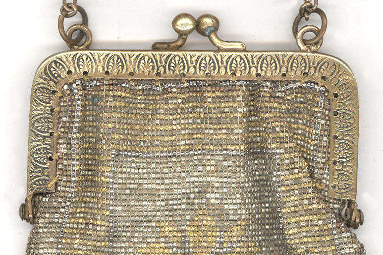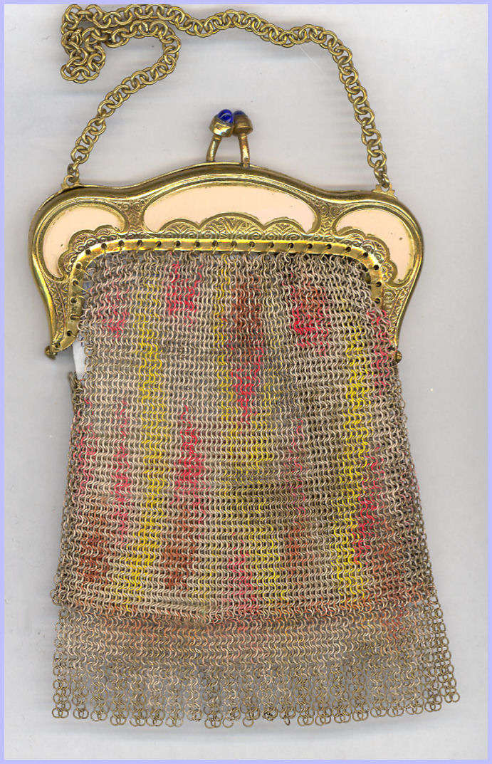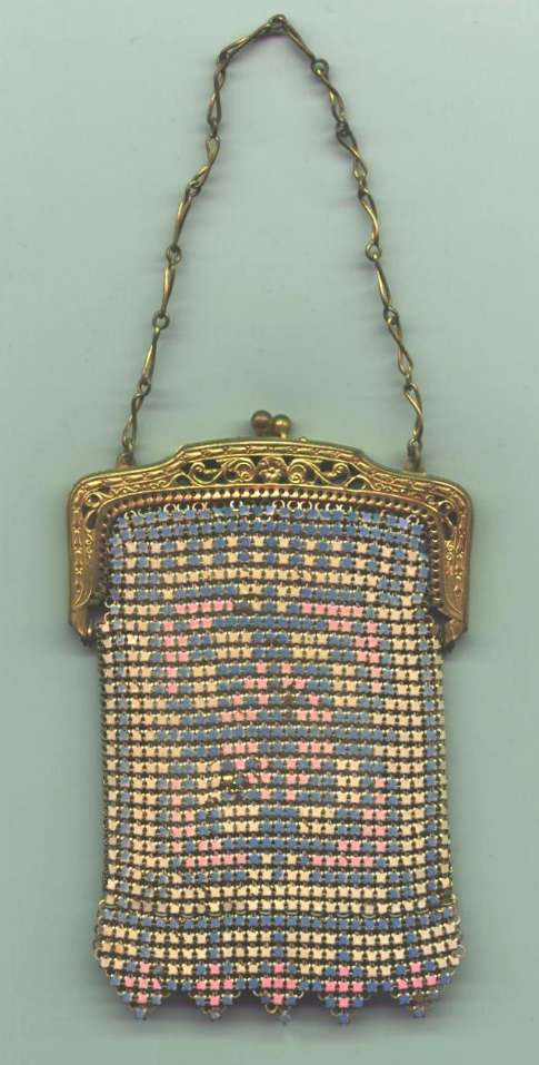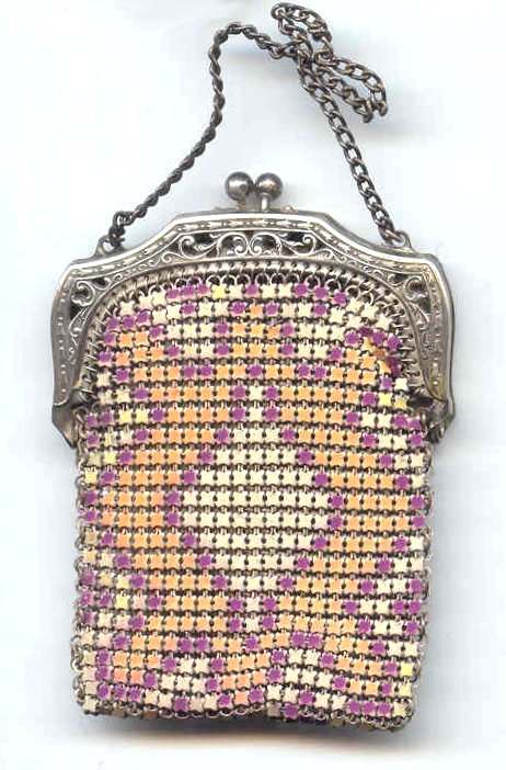 Sweet little Whiting & Davis child's Dresden mesh purse with fancy floral embossed frame. W & D signature is embossed inside the frame. The colors in this little purse are among the prettiest I have ever seen ... it is so reminiscent of a spring rainbow! And the little fringes are just darling. both sides are identical and the mesh is all in very good condition. The armpit opening may be a wee bit enlarged but is symmetrical on both sides and could be original that way ... it's not a detriment in any way. Measures 2-1/2" wide x 3-3/4" long. (Click on pic for more photos.) |