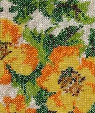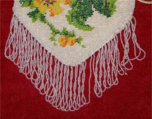 Purchased in a collection of purses from a town near Rochester, New York, which had belonged to the owner's grandmother and two were dated before 1894. The others were believed to be from around 1900 and this is one of the purses from the collection. This adorable little beaded reticule is done in microbeads of white with yellow flowers tipped with orange and vivid green leaves. Long intertwined looping beaded fringe finishes off the bottom. Top has original crocheted collar with silk drawcord intact. Interior is lined cream silk in excellent condition. Beadwork is all perfect excelt for two or three loops of fringe and one small pale tea-colored stain ... other than that, purse is perfect. Measures 3-3/4" wide at frame x 7-1/2" long to bottom of fringe (purse is 5-3/4" long). (Click on pic for more photos.) |