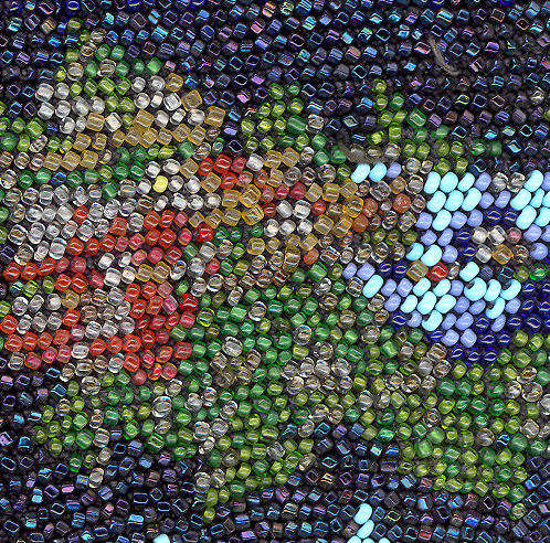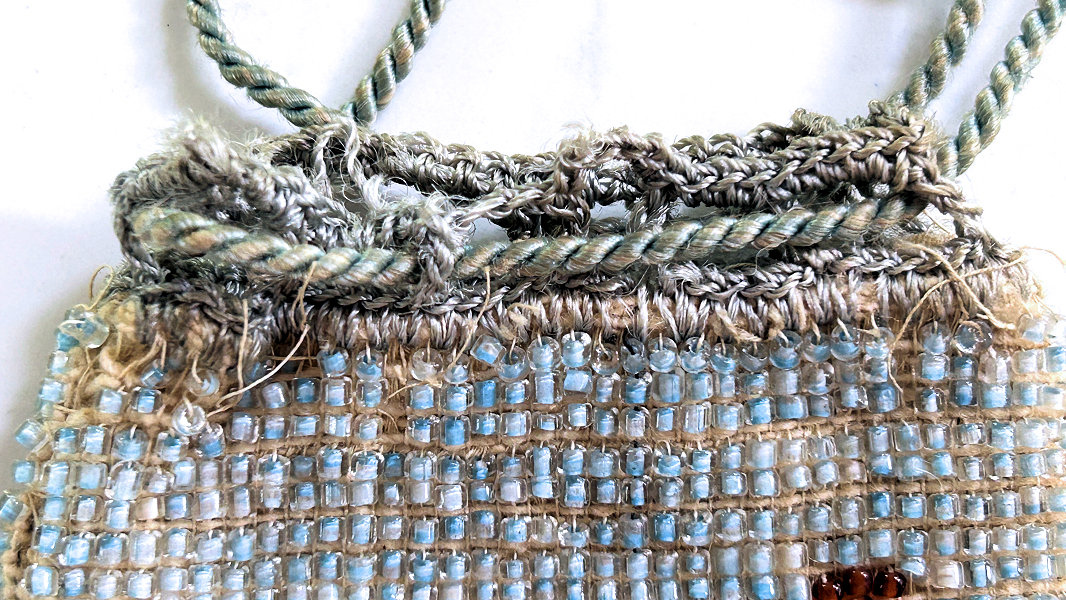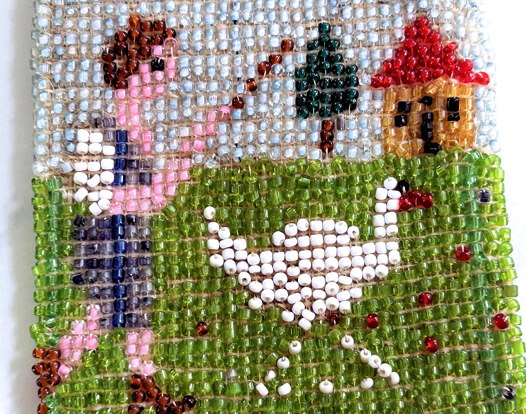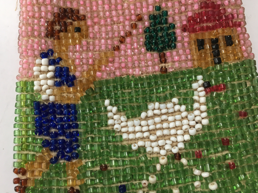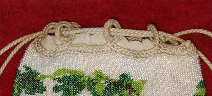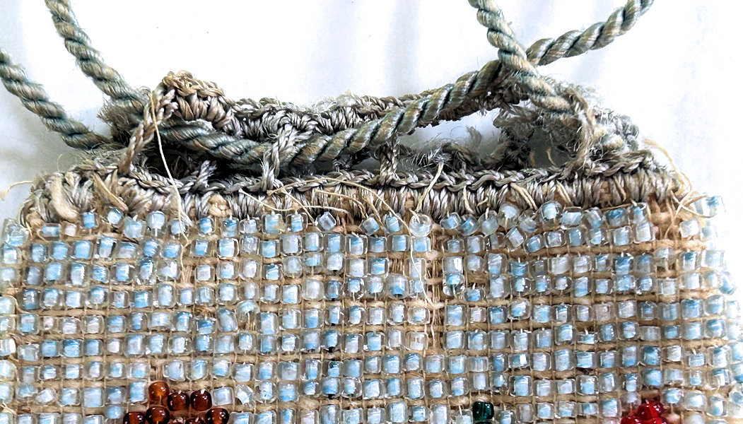 This darling little reticule is a very, very early purse dating from the mid 1800's and it is in amazing condition for its age! The scene continues from one side to the other depicting a farmhouse with silo and a bridge connecting it to what looks to me to be a schoolhouse with steps. There is a person on the bridge carrying something and another person walking toward the schoolhouse. There is a blue design in the sky that looks like birds even though they certainly aren't to scale. Above this is a garland of red roses. The tiny crocheted header still holds the original string drawcord and the little tassel on the bottom is made of the same string material. It is unlined but the knit backing acts as a self-liner. It is in excellent condition with no bead loss that I can ascertain and only one very early repair to one of the roses at the top left edge (visible in second picture). Measures 3-1/2" wide at top edge x 5-1/2" long to bottom of tassel. (Click on pic for more photos.) |