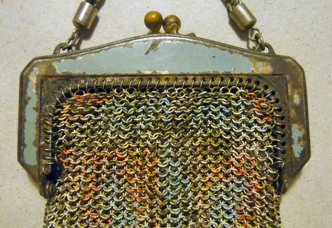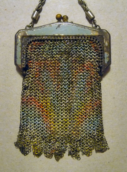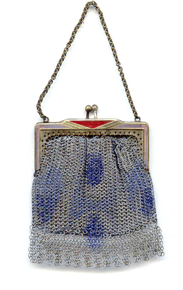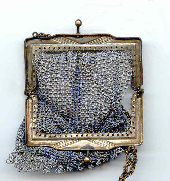 Children's purses have always been a favorite of mine and blue is my absolute favorite color! This is a rather rare purse in that it has a double-sided enameled frame. The body is ring mesh in shades of blue. The frame is enameled on BOTH sides in pale blue with a bright red accent triangle in the center. There is only very minor wear to the enamel in the blue portion and the red portion is perfect on one side and has a teeny pin dot barely discernible on the other. Now for the bad news (and it's not too bad!) ... the mesh is all present but it has come away from the frame in several areas and separated down the side on one side. HOWEVER, the rings do have openings and could easily be reattached to the frame and to each other if you have good eyes and the proper tools. I just don't have either!! But it would be a relatively easy repair for someone with patience and the wherewithall to do it since the rings aren't soldered. The wire that attaches the mesh to the frame is all intact, so it would be perfect when done. Because of that, the price is about 1/2 of what it would be if repaired. Even if it isn't repaired, it displays perfectly as you can see in the picture. This would make a great doll purse! Measures 2-5/8" wide at frame x almost 4" long. (Click on pic for more photos.) |