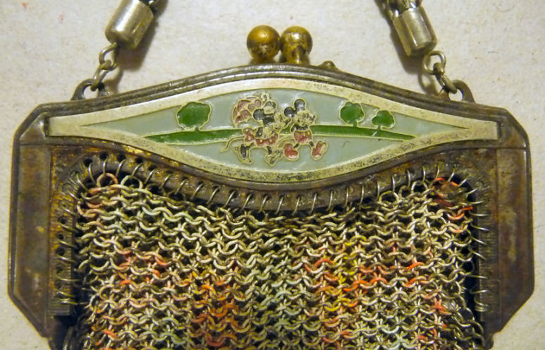 Oh but this was a much-loved little purse! This is a very rare design -- in fact, the only one of its kind I have ever seen -- featuring Minnie and Mickey Mouse out for a stroll. Minnie is holding an umbrella to protect her from the sun. Dating from the 1930's, the purse shows extensive wear and use. Little hands carried this purse back and forth to school with milk money probably tucked inside. The silver is worn off the frame and the enamel on the back of the frame is worn in several areas (pictures will show this in great detail). The mesh is pulled away from the hinges on both sides but this is not noticeable when hanging. The little handle is a braided type and it is in perfect condition. There is wear to the color on the mesh itself but in keeping with the wear on the purse overall. It is still an adorable purse and one that gives you a vibe of the child who loved it so! Measures 2-1/2" wide x 4" long not counting handle. (Click on pic for more photos.) |
