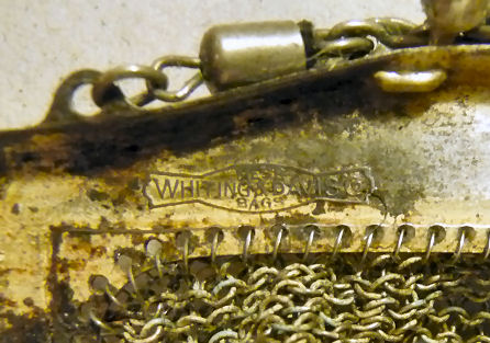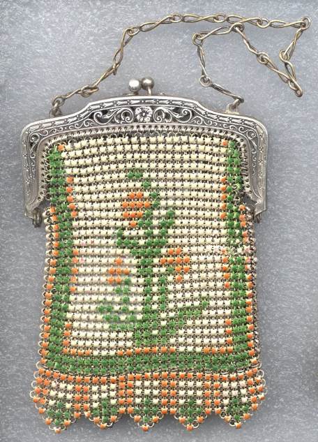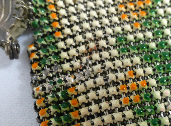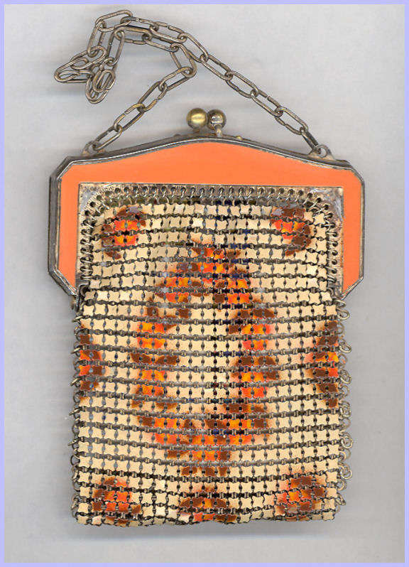 Sweet little Whiting & Davis child's mesh purse in a very rare floral wreath design with enameled frame. W & D signature is embossed inside the frame. The colors in this little purse are just stunning and in excellent condition ... bright orange and chocolate on a creamy background. Wow! Mesh is all attached to the frame and is in very good condition throughout. Enamel on frame is near perfect with only one extremely teeny fleabite on one side only. Measures 2-1/2" wide x 3-1/2" long. (Click on pic for more photos.) |