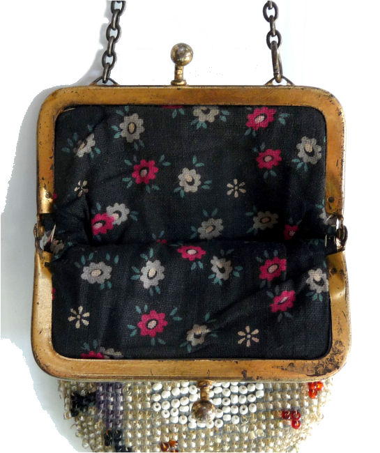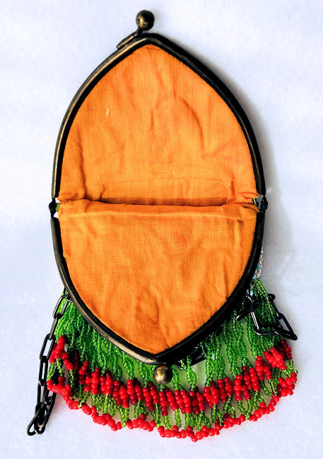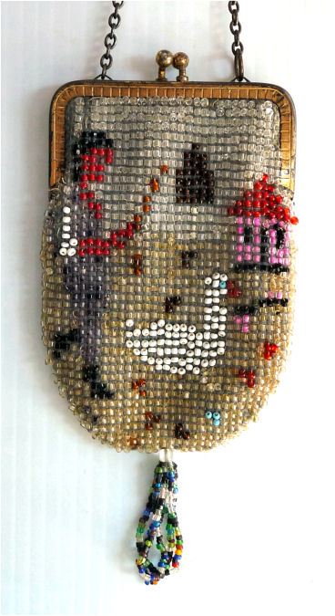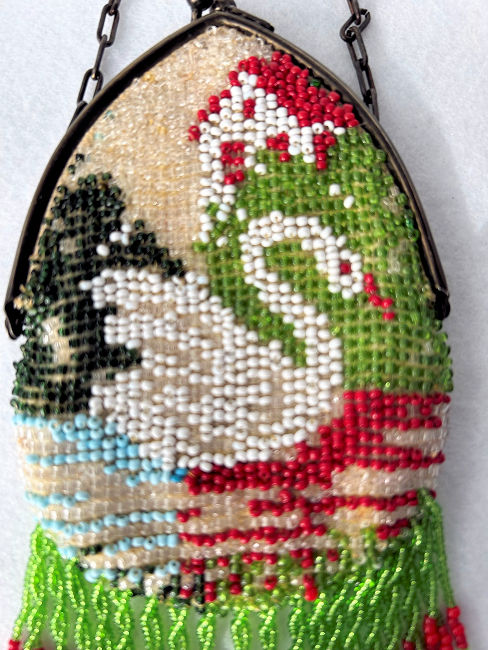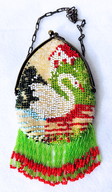 Here is a darling little figural glass-beaded purse featuring a full-bodied swan in the foreground with a house on a hill in the background. The purse has a lovely cathedral shaped frame with a kiss clasp and original chainlink handle, both in gunmetal color. The fringe is very lush and intricate for a child's purse ... in green and red from the colors of the scene. The reverse side (and either side could be the front) has the same scene but in a mirror image. Interior is lined in deep gold linen fabric which is original to the purse and is in excellent condition. I have looked very closely and I don't believe there are any missing beads on this purse although there are different styles and types of beads from seed beads to tube beads in varying sizes which give it a great contrast. It's just a truly beautiful little purse and must have been greatly treasured by it's original owner as it doesn't appear to have ever been used at all. It measures 3-1/4" wide x 6-1/2" long from top of clasp to bottom of fringe. (Click on pic for more photos.) |
