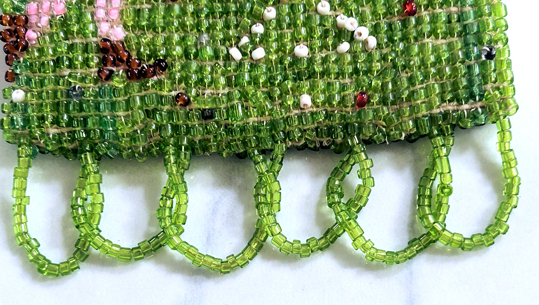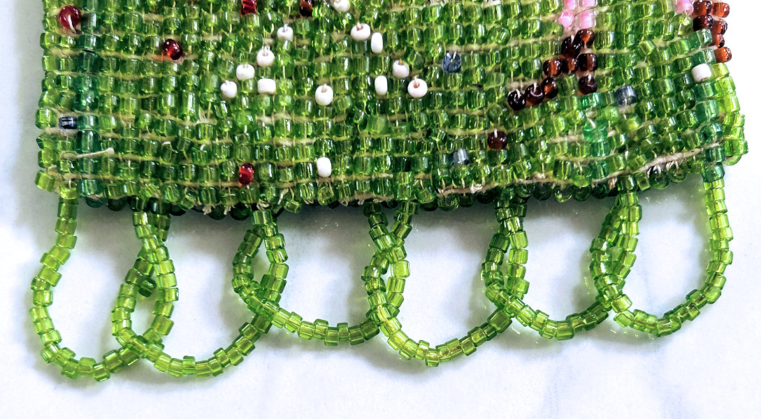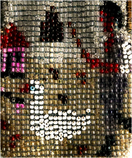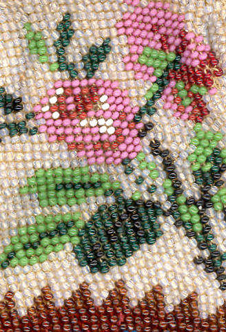 This is a very early child's beaded purse picturing roses on both sides with a typical sawtooth border at the bottom typical of the mid 1800's designs. The beadwork is in excellent condition. The interior is lined in a very early linen material and the purse appears to be crudely attached to the very pretty embossed brass frame. It almost looks as though a child's tiny hands sewed this purse to the frame herself. Two little beaded loops of fringe complete the purse. Measures approximately 3" wide x 4-1/2 " long. (Click on pic for more photos.) |