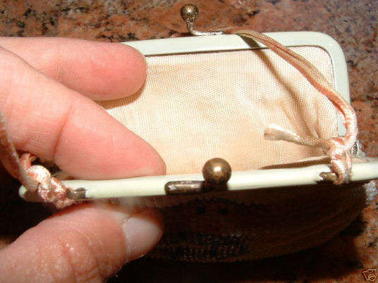I really have a "thing" for these darling little children's purses ... I can just see a little cherubic child carrying this to school with milk money tucked inside. This one even has a child's figure on the front in a blue dress and hat. When I bought this purse, I could fee something thick in the lining so I made a slit in the very bottom to see what was inside. When I removed what was in there, it turned out to be an old "squeaker" that would have made a sound when squeezed. If you blow on one end, it still makes a sound but I am unable to figure out how to make it work again. There may have been a little rubber air bag at one time, but if so, it was completely disintegrated as there was not a trace of it inside. I am including this in the hopes that someone will be able to restore it again. Overall in very good condition with a few chips to the enameling on the frame (both sides shown in pics). Handle is a pink silk ribbon that may or may not be original but is definitely old as it shows its age. Measures 3-1/8" wide at frame, 4" wide at bottom x 3-1/2" long. (Click on pic for more photos.) |