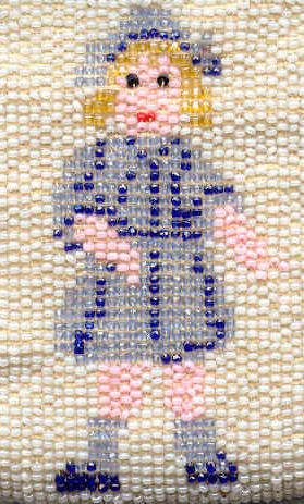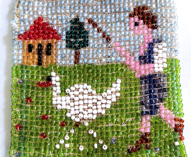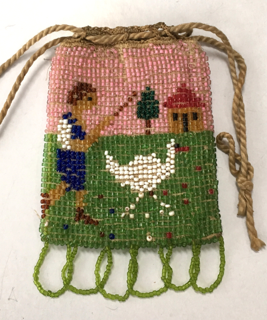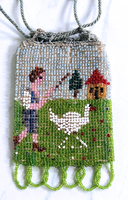 This sweet little figural child's reticule features what appears to be figures from a Mother Goose nursery rhyme albeit I'm not sure which one. There is a young boy with a white goose and a red-roofed schoolhouse with a tree in the background. Both sides have the same image only in reverse. The inside has its original taupe lining which is in excellent shape. The top has its original crocheted collar with the original drawcord still intact. The bottom features wide looped intertwined beaded fringe. Overall the purse is in very good condition with a sprinkling of beads missing here and there, mostly right along the top edges that the close-ups will clearly show. There are no holes and nothing that affects the design. It is a truly sweet purse and I can just imagine the little girl dressed in her Sunday best who carried this treasure. The body of the purse alone measures 3" wide x 3-1/2" long. If measured from top of neck to tip of fringe, it is 4-1/2" long. Note: This must have been a popular design as I have the same purse in slightly different colors with a frame just below. (Click on pic for more photos.) |