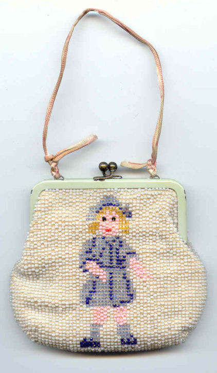 This sweet little figural child's purse features what appears to be figures from a Mother Goose nursery rhyme albeit I'm not sure which one. There is a young boy with a white goose and a red-roofed schoolhouse with a tree(?) in the background. Both sides have the same image only in reverse. There is a gold frame with incised design and a beaded tassel at the bottom. The inside has its original floral print lining which is in excellent shape. Overall the purse is in very good condition with a sprinkling of beads missing here and there but no holes and nothing that affects the design. The pictures will show you clearly where there are any missing. It is a truly sweet purse and I can just imagine the little girl dressed in her Sunday best who carried this treasure. The body of the purse alone measures 2-3/4 " wide at frame x 4-1/4" long. If measured from clasp to tip of fringe, it is 6" long. (Click on pic for more photos.) |