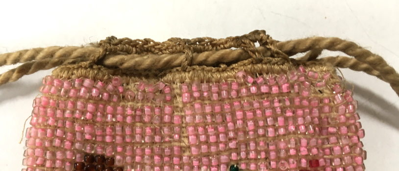 I have not run across too many steel-beaded children's purses ... probably because these types of purses generally did not last and a child's purse would definitely not stand the test of time! So to find one in this condition is a real coup! It is just darling in a vibrant pink with the original silk drawcord and a silk ribbon rosette. There are also gold and turquoise blue beads in the design as well as in the loosely looped fringe. It is in excellent condition as the pictures will attest. Measures 2-5/8" x 3-1/2" not counting fringe. (Click on pic for more photos.) |
