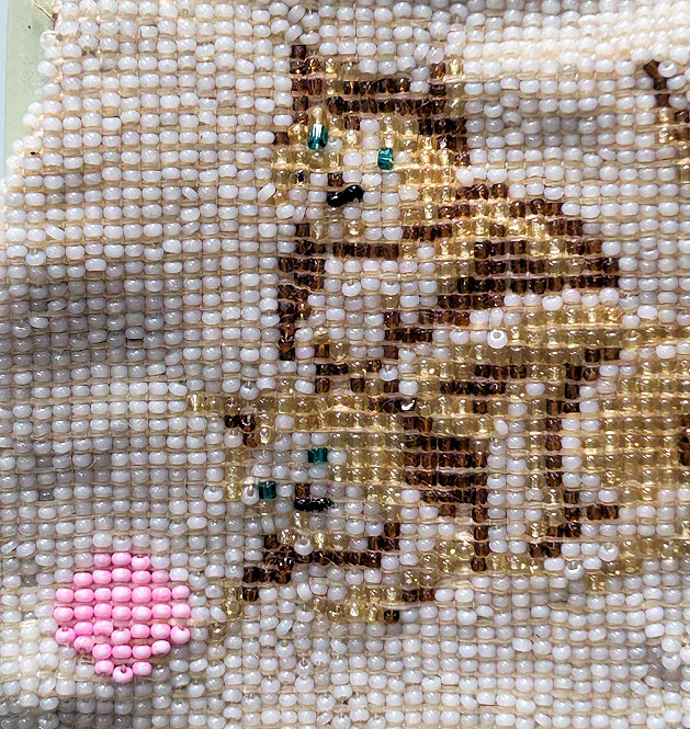 This adorable little glass-beaded purse features two blue-eyed kittens playig with a ball of pink yarn on both sides. The metal frame is painted a very, very pale green, almost not discernible even as green but thereis just a hint of it. There are a few very tiny chips on one corner as shown in photos.. The background on the purse is ivory and the kittens are brown and gold with ivory and sparkly teal eyes. It is lined in a beige material in good condition. There are a few beads missing here and there but nothing detrimental. There are also some very light brown spots visible in pics, but overall it is in great condition.. The purse is totally usable if you have a child or grandchild who would enjoy it. Measures 3-1/8" wide at frame, 4-1/8" wide at bottom, and about 3-1/2" from top to bottom. (Click on pic for more photos.) |