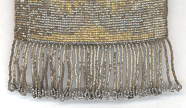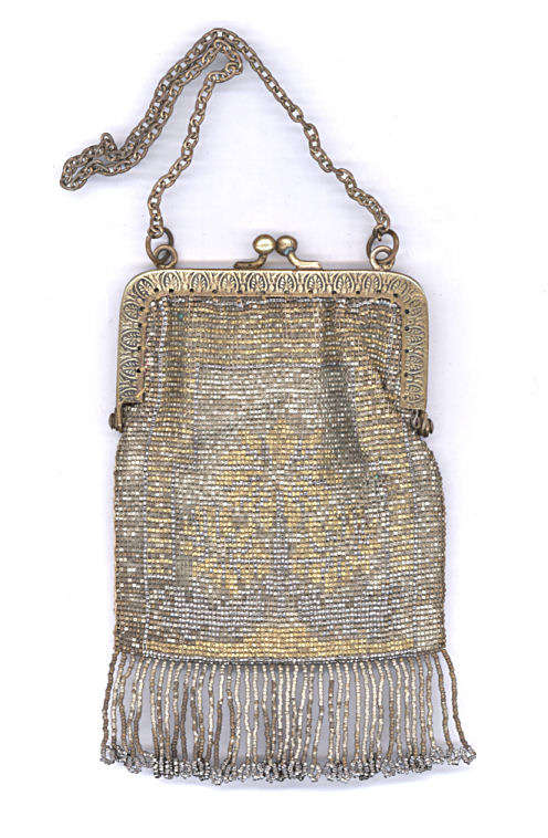 Even though the pictures are BIG, this is a tiny child's size French steel-beaded purse. It's size is only 3-1/4" wide x almost 6" long to the bottom of the fringe. The purse is done in gold and silver beads and is in very good condition overall considering its age. There is some minor discoloration to the beads but nothing significant ... the scan makes it look much worse than it is ... in person it looks a lot better! The interior retains its original lining and pink ruched trim with only a few little splits inthe silk. This was purchased from a private local collection and is the first time it's been offered publicly. (Click on pic for more photos.) |