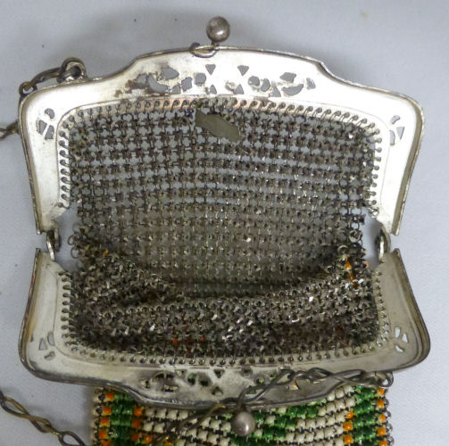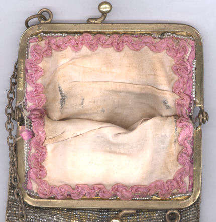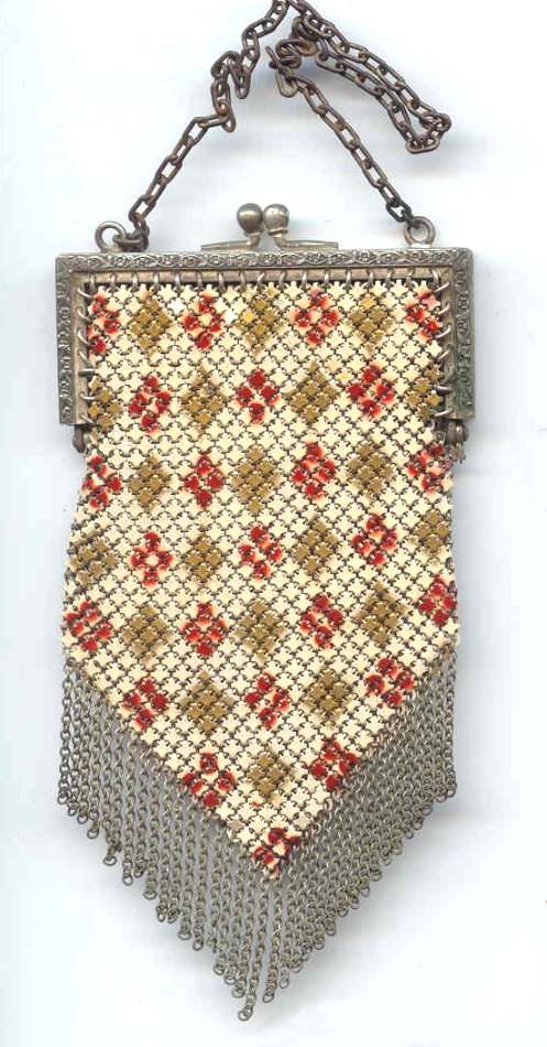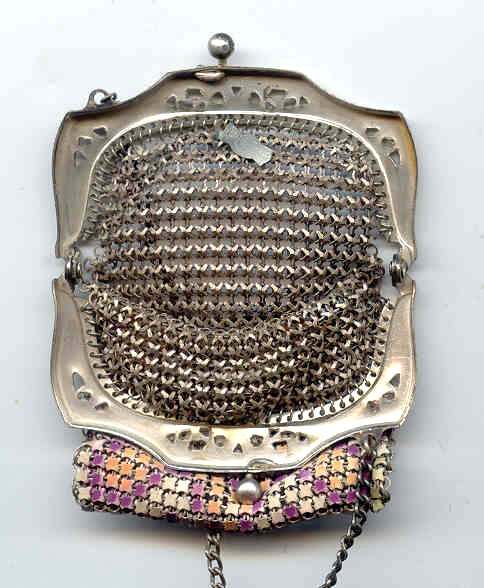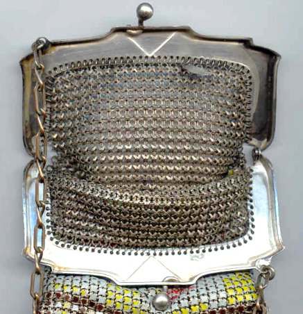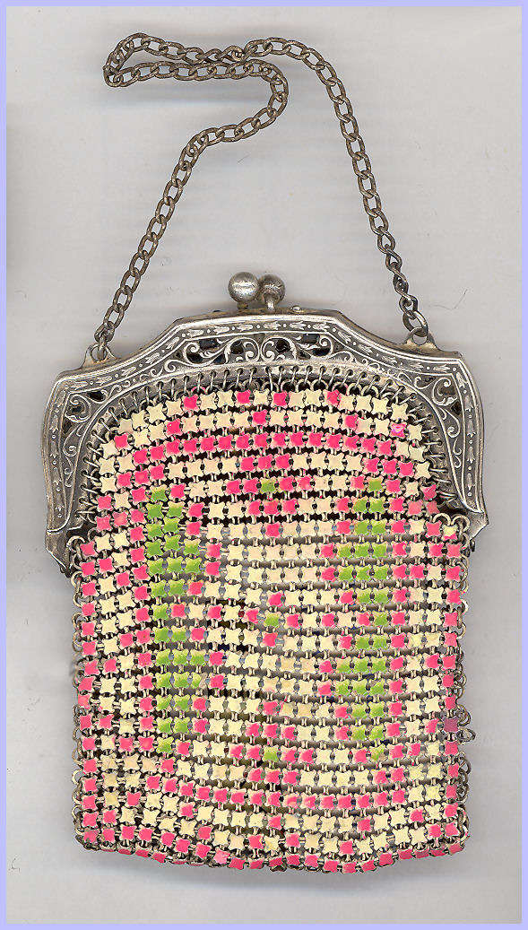 Sweet little Whiting & Davis child's deco design mesh purse with fancy filigreed frame. W & D metal hang tag inside the frame. The colors in this little purse are just stunning and in excellent condition ... bright hot pink and lime green on a snowy white background. Wow! Mesh is all attached to the frame and is in very good condition throughout. Measures 2-1/2" wide x 3-1/4" long! (Click on pic for more photos.) |