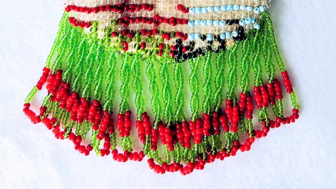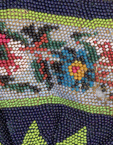 This is a darling little child's beaded purse in a very colorful design. The beadwork is in great shape and the little metal frame has a dark patina. The interior is lined and is also in perfect condition. Pretty little looped fringe completes the purse. Measures approximately 3" wide x 4" long. (Click on pic for more photos.) |