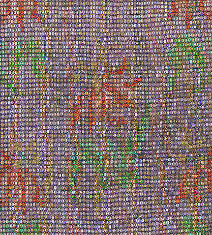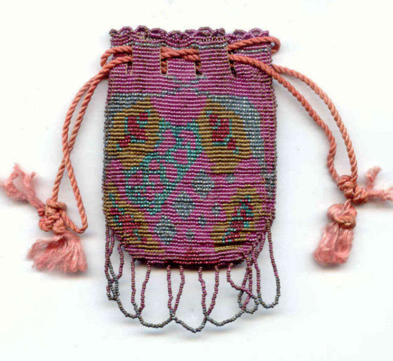 This is a very pretty little child's French steel-beaded reticule in a very pretty shade of lavender with green and orange flowers on both sides. The little fringes are tipped in gold. There is a drawcord at the top but I'm not sure how to make it work to close the purse. All beads are intact and there is no separation of loss. It is just darling! Measures approximately 3-1/4" wide x 4-3/4" long. (Click on pic for more photos.) |