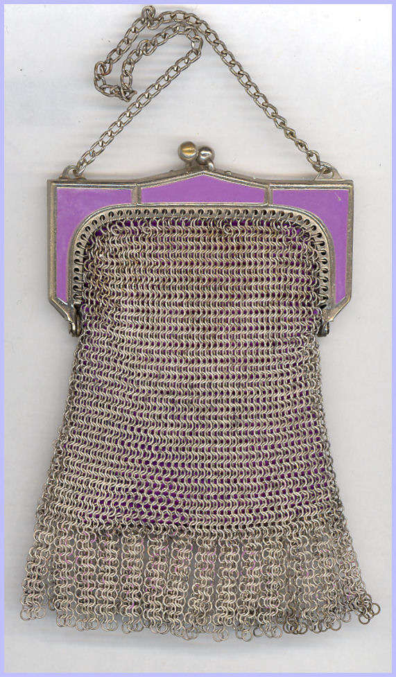 This darling little Whiting & Davis child's mesh purse has a beautiful lavender enameled frame. W & D name is embossed on the inside of the frame. Very fine silver ring mesh with thick double fringe all in excellent condition. The interior is lined in a pretty purple silk and is in perfect condition inside and out with only one teeny little fleabite in the enamel on one corner (visible in pic). Measures 2-1/2" wide x 4-1/4" long! (Click on pic for more photos.) |
