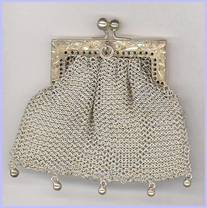 Very pretty little child's sterling silver mesh with fancy embossed frame and cute little ball dangle fringe. No chainlink handle but there is a little ring on the front where this could be attached to a chatelaine. Mesh is all attached to the frame with the exception of one tiny ring right near one hinge and one disconnected link under the armpit. Due to the fullness of the design and the way the purse drapes when hanging, this is indistinguishable. Measures 2" wide x 3-1/4" long. (Click on pic for more photos.) |