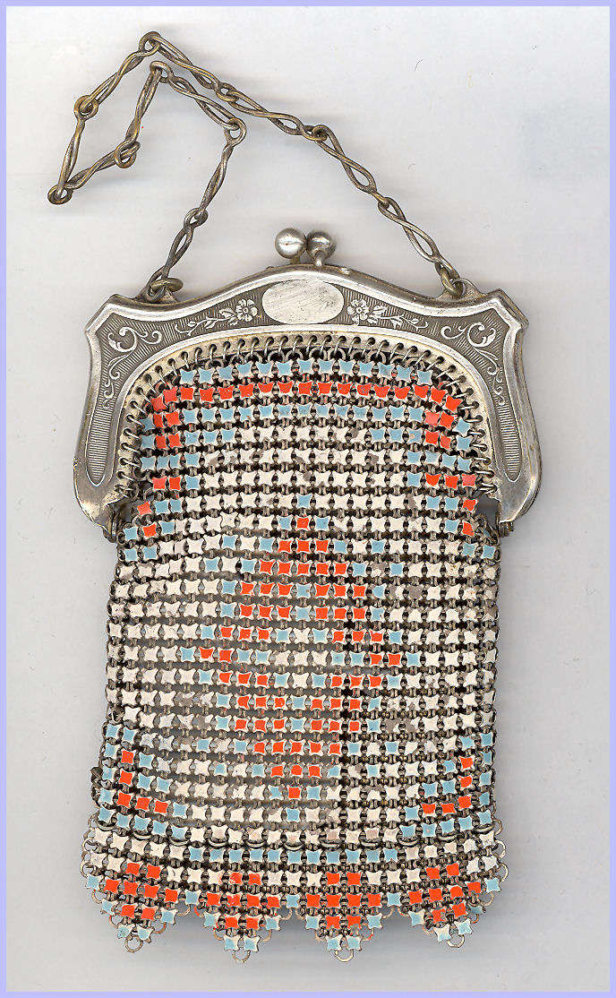 This is an adorable little Whiting & Davis child's mesh purse that is perfect to use with a larger doll. The mesh on this one is quite lovely ... pale blue background with geometric squares in purple and pink and a yellow design between those. The Van Dyke fringe is outlined in the colors of the purse. Pretty silver frame is embossed with delicate designs on both sides. Mesh is all tight to the frame and there is almost no enamel loss on this one ... very slight wear on fringe tips and only a teeny speck here and there on the body ... almost impossible to find. Measures 3-1/4" wide at frame x 5" in length overall (not counting handle). (Click on pic for more photos.) |