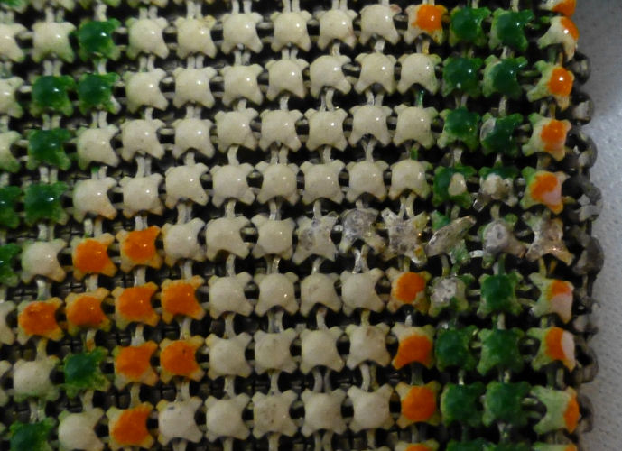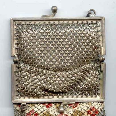Here is a darling little Whiting & Davis Beadlite mesh purse with a beautiful flower design (it has the Whiting & Davis hangtag inside). It has an openwork frame with a flower in the center and lots of fancy engraving. The interior is pretty good.... there is a slight gapping at the armpits but really not much at all. The pictures will accurately show this. Also, there is a little section on each side with some wear to the enamel on the beads but strangely on reverse sides of the same area so it is almost as if it got caught in something. Other than this the enamel is in absolutely fabulous condition. Most child's purses have significant wear and this would be near mint if it weren't for that little bit of damage. It is really almost not noticeable to the naked eye but the close-ups make it look much worse than it is. Measures 3-1/4" wide x 4-3/4" long not counting handle. (Click on pic for more photos.) |