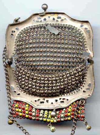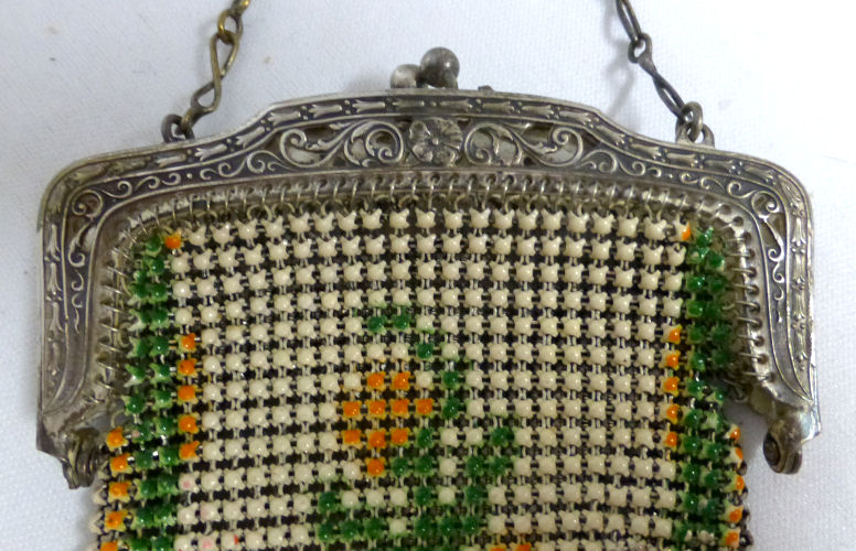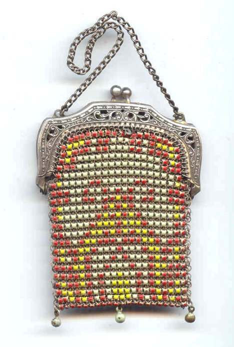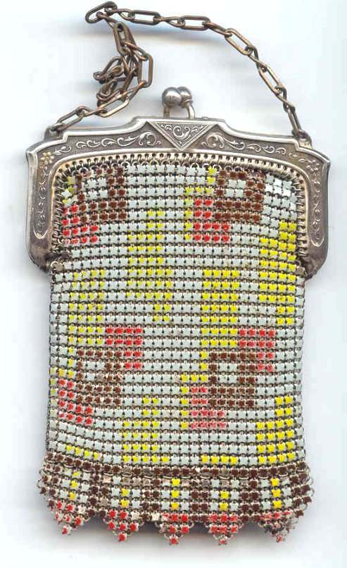 This is an adorable little Whiting & Davis child's mesh purse that is perfect to use with a doll. The mesh on this one is the beadlite style, rounded tops of the tiles make the purse appear to be beaded. The silver openwork frame is beautifully embossed and the purse is finished off with three little dangles. The enameling on the purse body is truly excellent. The little dangles are missing some of their green enamel. Colors are pale green, yellow and red. Mesh is all tight to the frame and it is in excellent condition. Measures 2-1/2" wide at frame x 3-1/2" in length overall (not counting handle). (Click on pic for more photos.) |