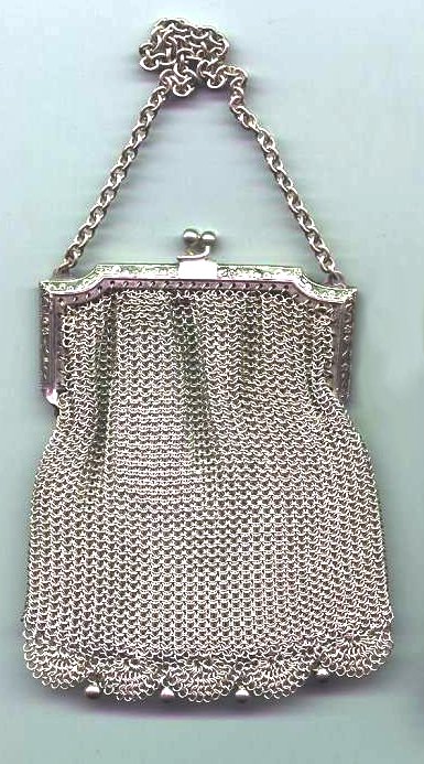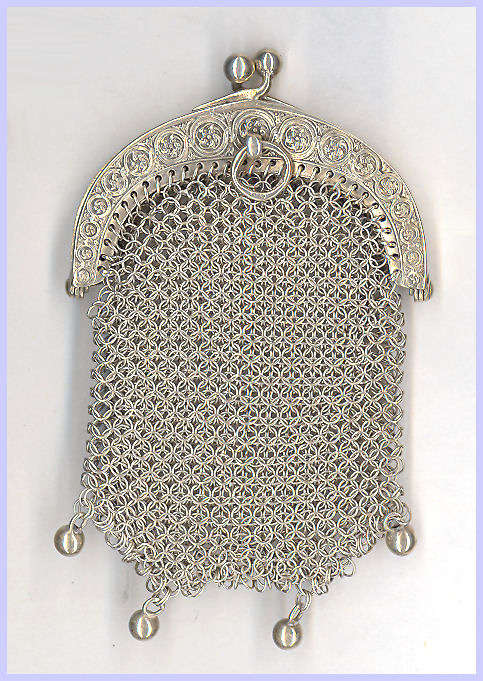 This adorable little child's mesh purse is not marked sterling but I'm pretty sure it is ... it was tarnished and polished up beautifully. All done in very tiny ring mesh with an embossed silver frame, it is in excellent condition. There are no missing links or disconnects. The bottom is finished off with scalloped mesh fringe accented with tiny silver balls. Lovely heavy link chain handle is original to the piece and in great shape as well. This little treasure measures approximately 3" wide x 4-3/4" long. (Click on pic for more photos.) |