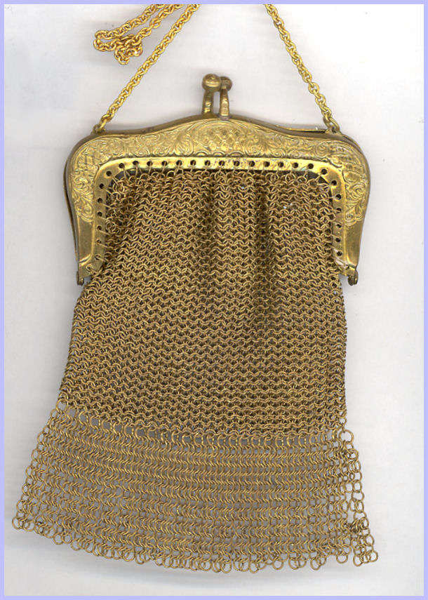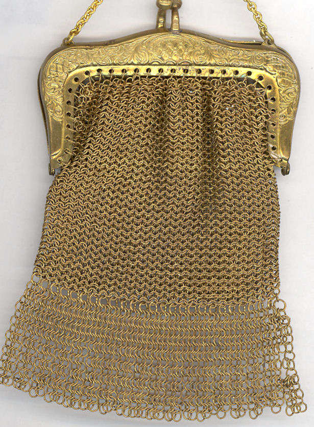 Very pretty little gold tone child's mesh purse that was made in Germany (marked inside frame). The frame is richly embossed on both sides in a very pretty lattice and floral design and the fringe is a double design ... very cute! Excellent condition throughout ... measures 2-1/2 " wide x 4-1/4" long overall. (Click on pic for more photos.) |