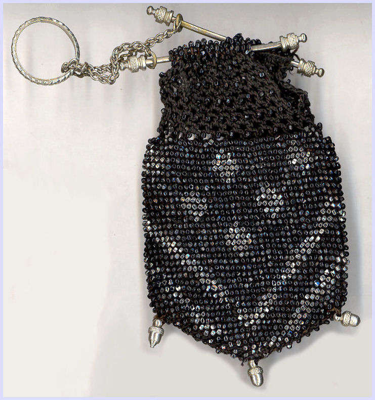 This is a very early (mid 1800's) child's beaded purse in a modified miser style. The beadwork is in excellent condition and is done in a combination of jet glass beads and silver cut steel beads (no rust whatsoever). There are little metal bars at the top with decorative finials on the ends to which the purse is crocheted to. These are attached to chains with a finger ring at the top. Three little acorn-shaped beads at the bottom complete the fringe. Measures approximately 2-1/2 " wide x 4" long not counting chain and ring. (Click on pic for more photos.) |
