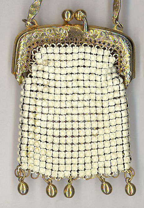 Very pretty little gold framed child's mesh purse done in beadlite mesh (tiny tiles with rounded dome shape resembling beads ... usually by Whting & Davis). The frame is richly embossed on both sides in a very pretty floral design and the fringe is done in tiny gold ball dangles ... very cute! The chainlink handle on this purse is exceptional as it consists of many embossed links and measures almost 3 feet long in total (17" drop). Color is a white shade in very good condition ... all mesh is present and attached to frame and hinges. The purse itself measures a wee 2" wide x 3-1/4" long. (Click on pic for more photos.) |