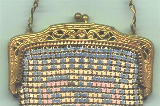 This sweet little child's purse is done in pastel blue and pink on a cream color background. The gold (brass) frame is ornately embossed in openwork design and really a step up for a child's purse! Unlike most mesh children's purses, this one is in excellent shape with very little, if any, wear. The enamel is all in pretty good shape ... there may be a tile or two missing enamel but that is all. All links are intact with no missing tiles. This little beauty measures approximately 3-1/4" wide at frame x 4-1/2" long. Body of purse is only 2-3/4" wide. (Click on pic for more photos.) |