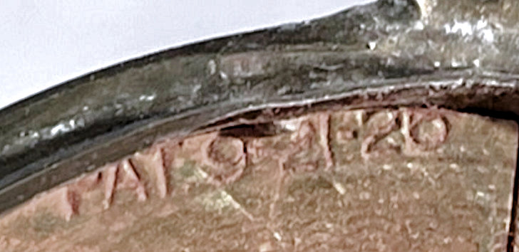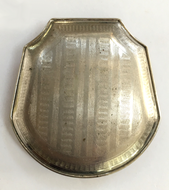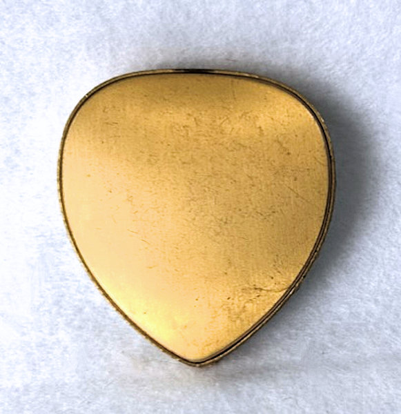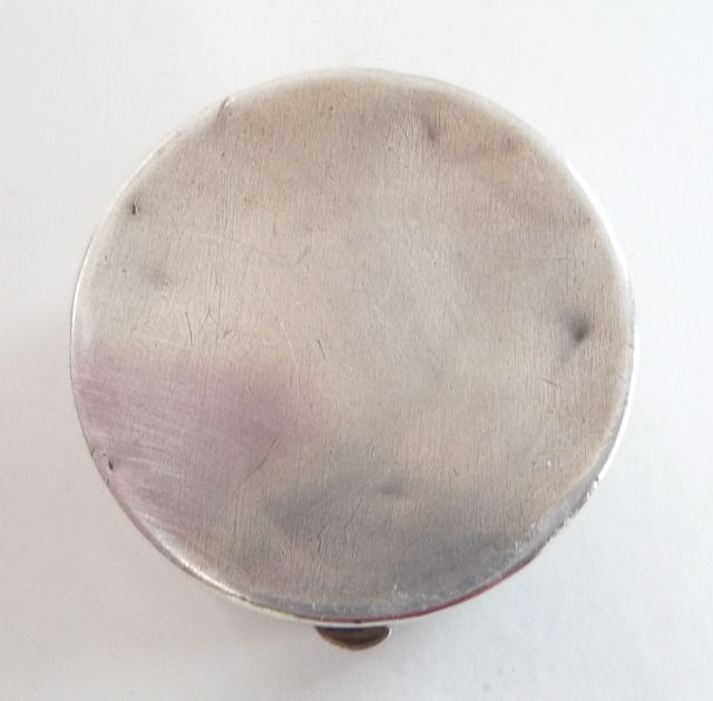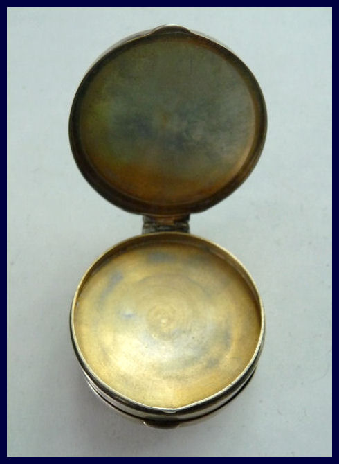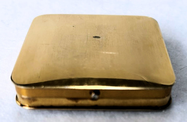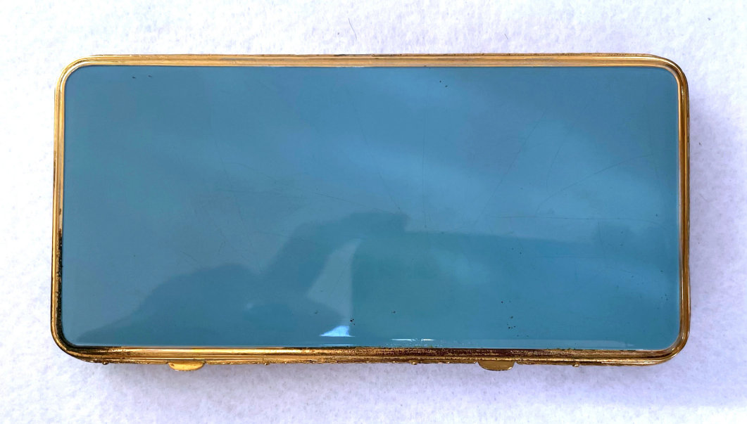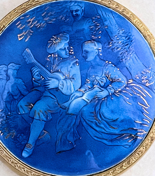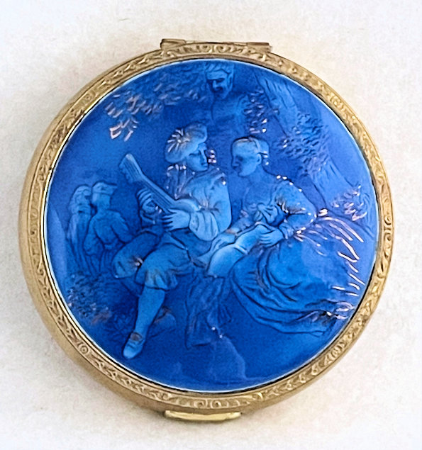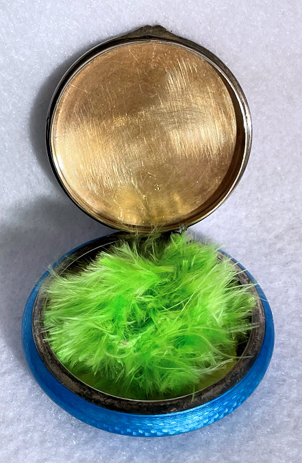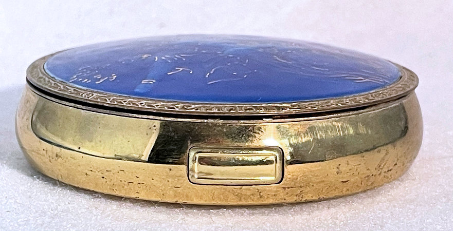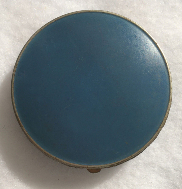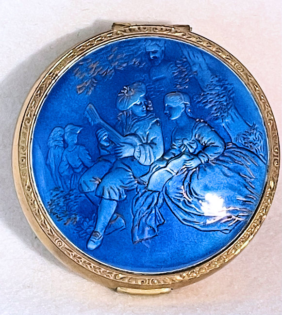 Basse Taille is a very rarely found enameling technique and this one is done in a beautiful royal blue with highlights of the underlying metal showing through. Made by Evans, the scene is of a famous Watteau painting from 1726 entitled "Girl with Music Manuscript Book". The scene is done in varying reliefs which give depth to the enamel and that you can feel on the surface. It's just gorgeous! The case itself is brass and has embossed trim around the edge of the scene. The sides are polished and the base is finished in concentric circles. There are some specks visible in the polished portion if looking closely. These might easily polish off but I prefer to leave them as found. Inside is a full size mirror in the lid in excellent condition. The base would hold loose powder and has the original screen. The original Evans signed puff is still inside but has come apart due to age although it has never been used. Measures 2-5/8" diameter. (Click on pic for more photos.) |