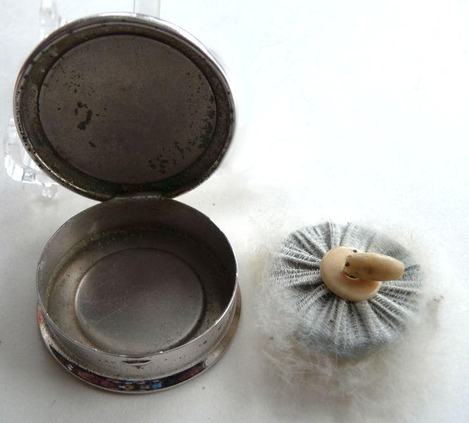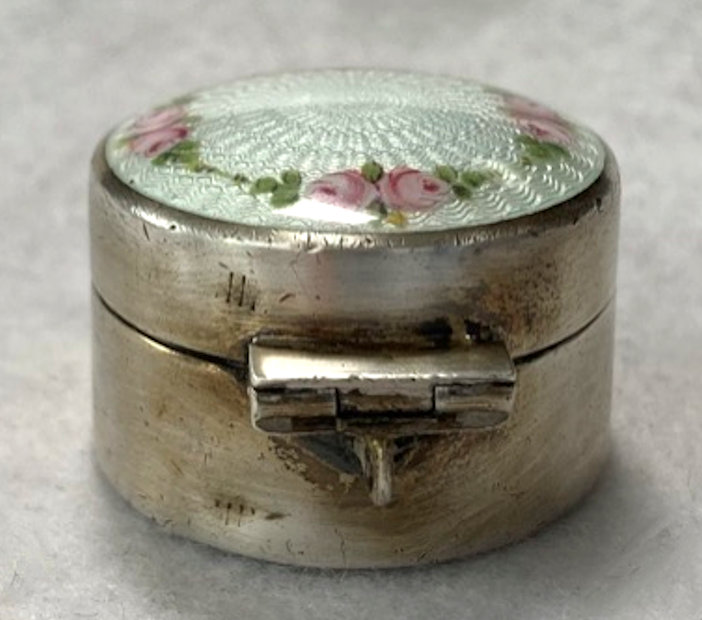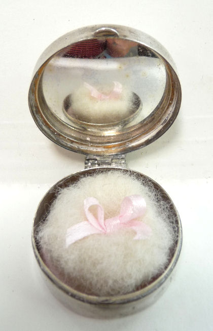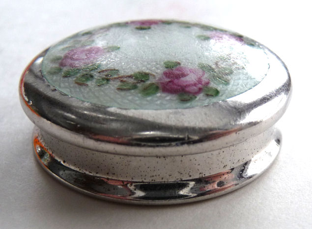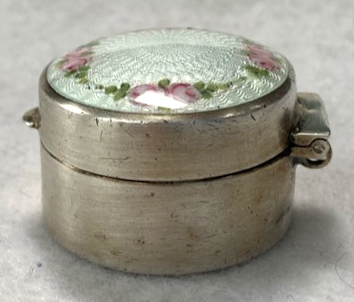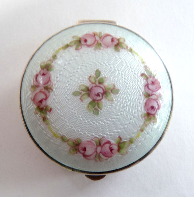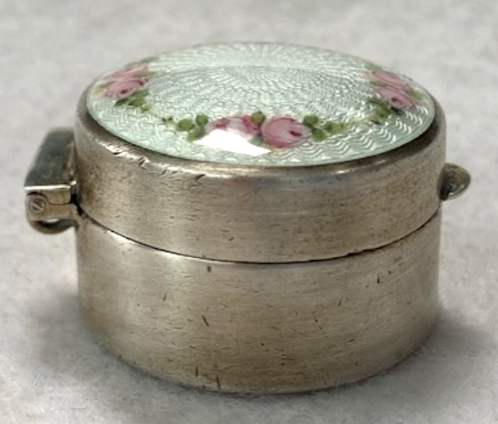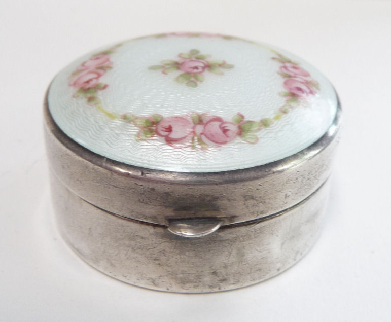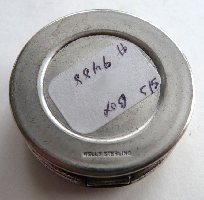 Here is a darling little sterling silver compact or patch box which was made by Wells, Inc. of Attleboro, Massachusetts. The box has a wreath of hand-painted pink roses on a snowy white enamel guilloche background ... so pretty! The compact opens to reveal a sweet little swansdown puff with silk ruching and a faux ivory handle (down is pretty worn). There may or may not have ever been a mirror in the lid ... there is no indication that there was one but there is room to add one in if desired. The lid snaps shut tightly so this could easily lend itself to use as a pill box. It is stamped Wells Sterling on the bottom. The lid has a rolled edge as does the bottom which makes a nice profile from the side. Measures a bit over 1-1/4" diameter (tiny!) x a bit under 1/2" deep (lid is slightly domed). Enameling is in great shape with no chips or damage that I can see. (Click on pic for more photos.) |
