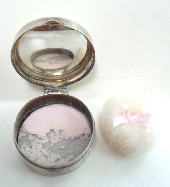 Always a favorite are lavendar or purple compacts as they are so hard to find. This one is an especially pretty example (possibly made by McCrae & Keeler of Attleboro, Massachusetts). The front is all dont in lavender enamel guilloche with hand-painted flowers on the lid and the outer edges finished with little blue ribbons. The interior is fitted with a crescent shaped mirror in the lid above a new rouge pot still with foil cover. The bottom half has a rotating powder sifter and a clip to hold a puff. The back of the compact is engine turned in a very pretty design. All in all it is in excellent condition with no damage other than a bit of oxidation on the silver trim. Measures approximately 2-1/4" across x 2-3/8" high. (Click on pic for more photos.) |