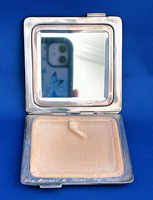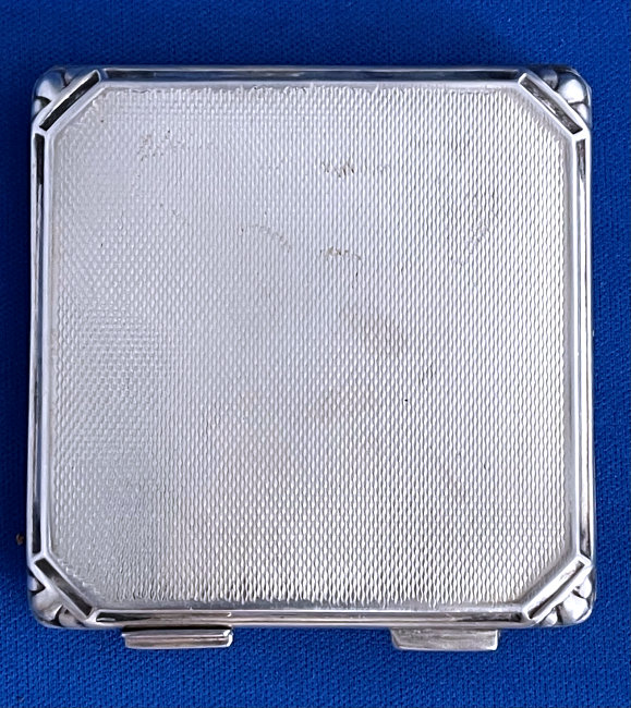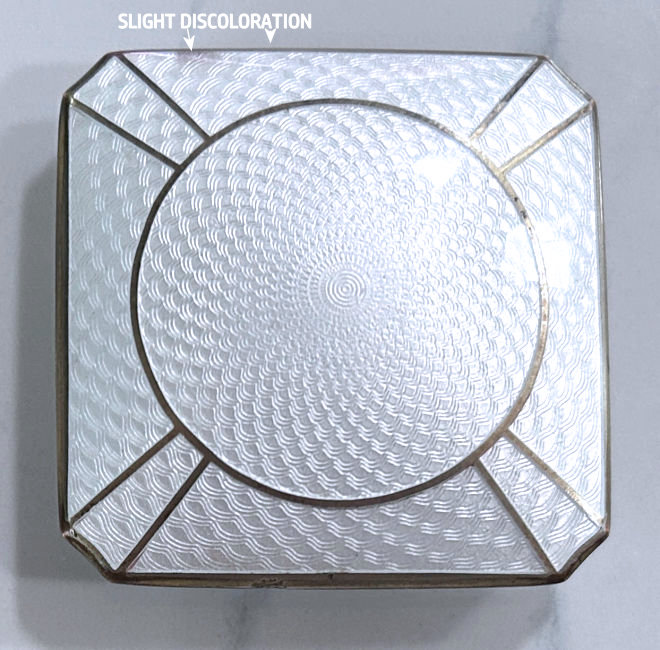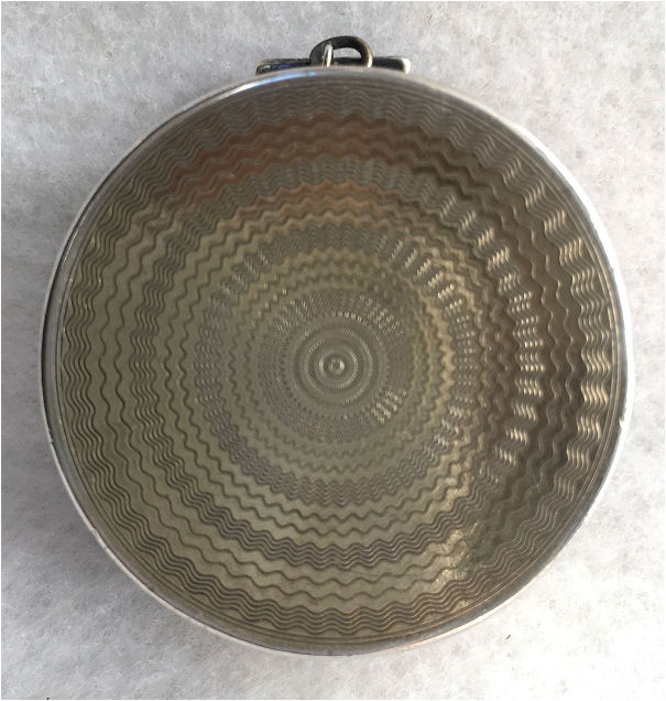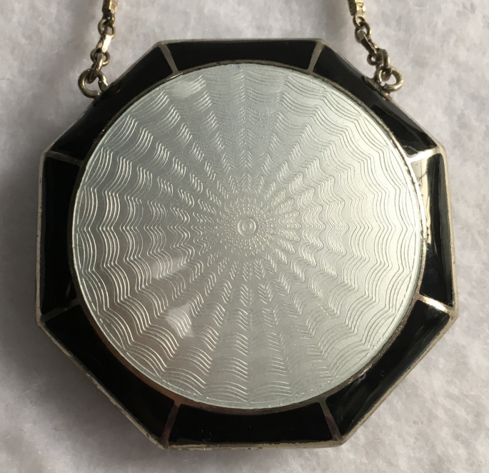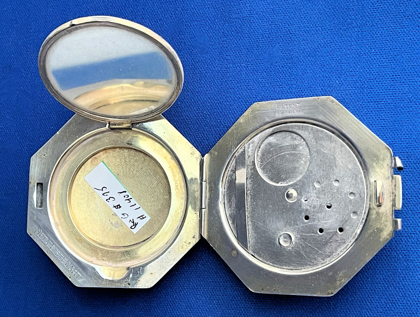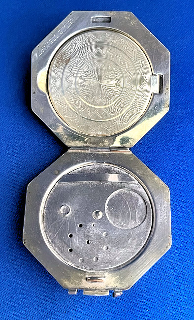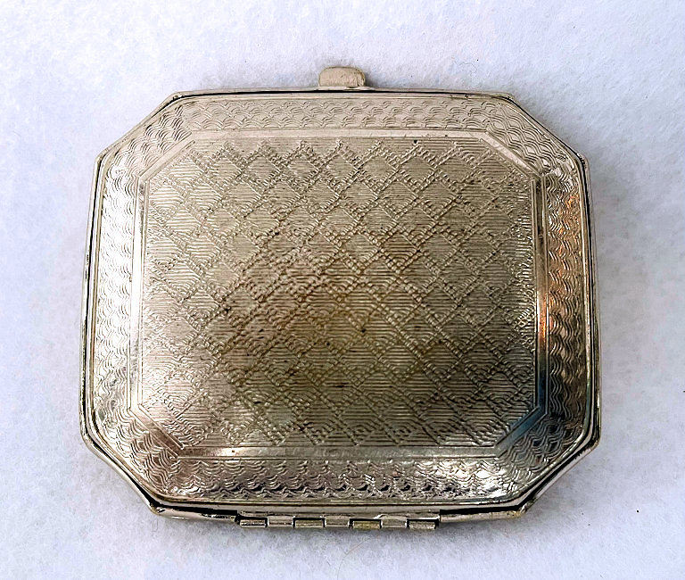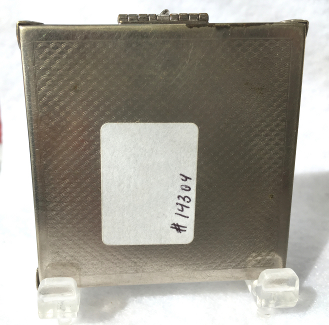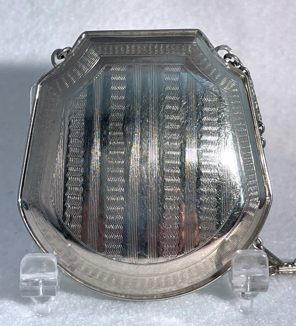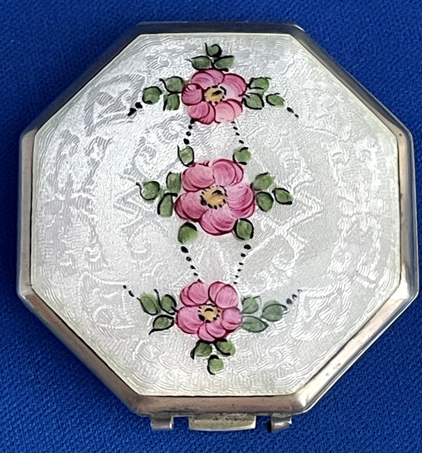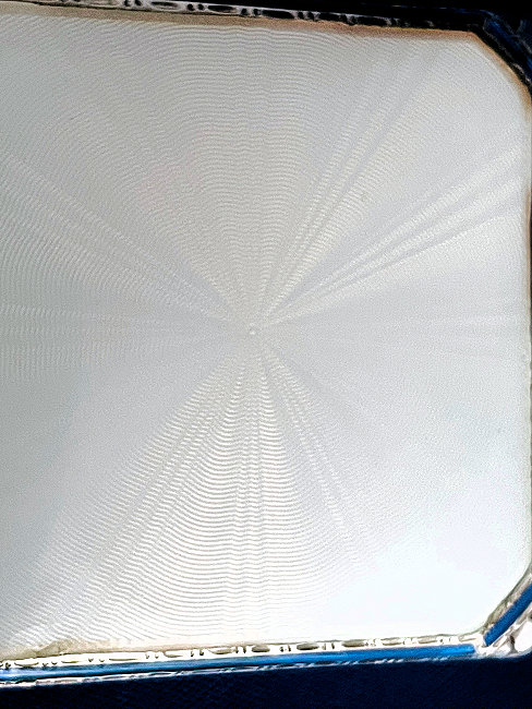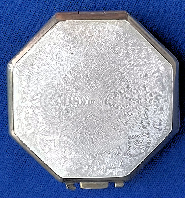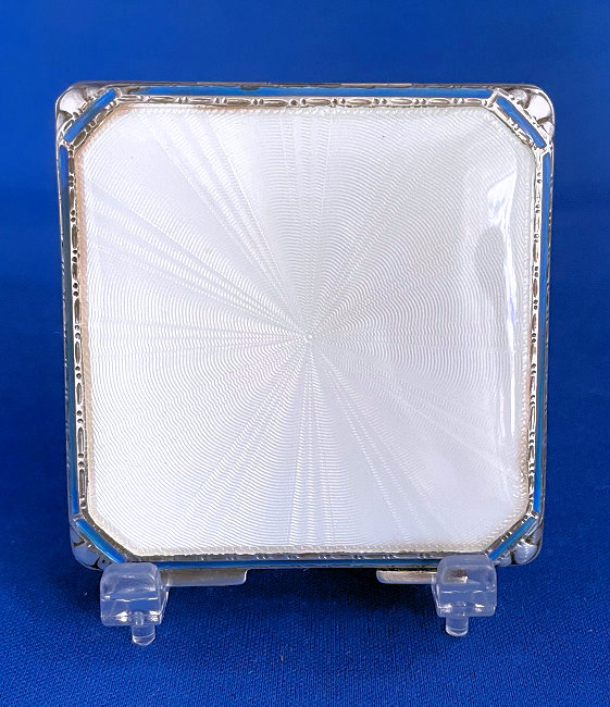 This has long been in my collection and had been stored away since 2002! I recently came across it and have decided to offer it here. It is a beautiful sterling silver compact with hallmarks from the Northern Goldsmiths & Silversmiths Co. of Birmingham, England. The hallmarks date this piece to 1939. The case is engraved around the perimeter and the entire surface is done in a snowy white enamel guilloche with radiating rays that glisten in the light. This is surrounded by a very thin border of of blue enamel inlaid in the engraved silver. The back is an engine-turned design. Inside you will find a full beveled mirror in the lid in excellent usable condition. The base has a powder screen over an open powder well. Inside the powder well you can find the hallmarks for the Northern G & S Co. and the date marks for Birmingham, 1939. What I love most about this compact, however, is the inscription on the lower edge "From ANDREW to MARY May 1942". I can't help but wonder ... was this a birthday gift? Engagement gift? Christmas gift? It could have been any of those things or something else entirely. I wonder where Mary and Andrew are now and wish I could find her to return her lovely compact to her. When I find inscriptions like this, my mind runs away with all the what ifs? Overall it is in excellent condition with virtually no scratches to the surface at all. There is, however, a flake in the clearcoat along the lower right side edge that is visible in the photos but in person you would never notice it. The back has a few darker spots in the silver ... very faint but I need to point out. Measures 2-5/8" square. (Click on pic for more photos.) |