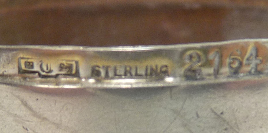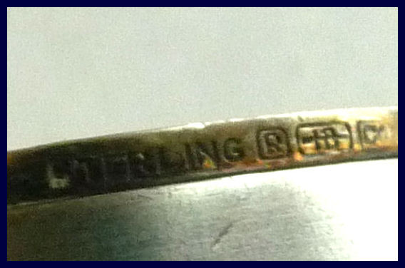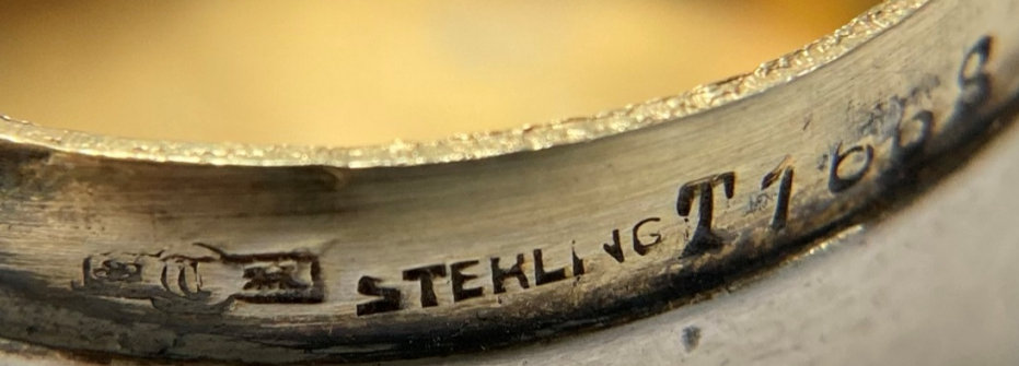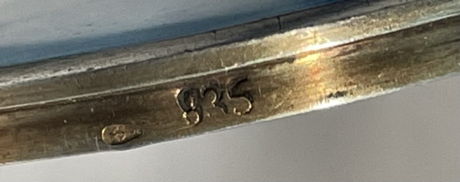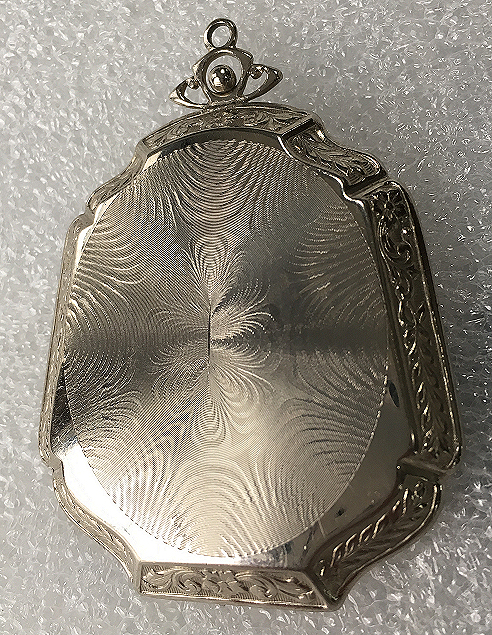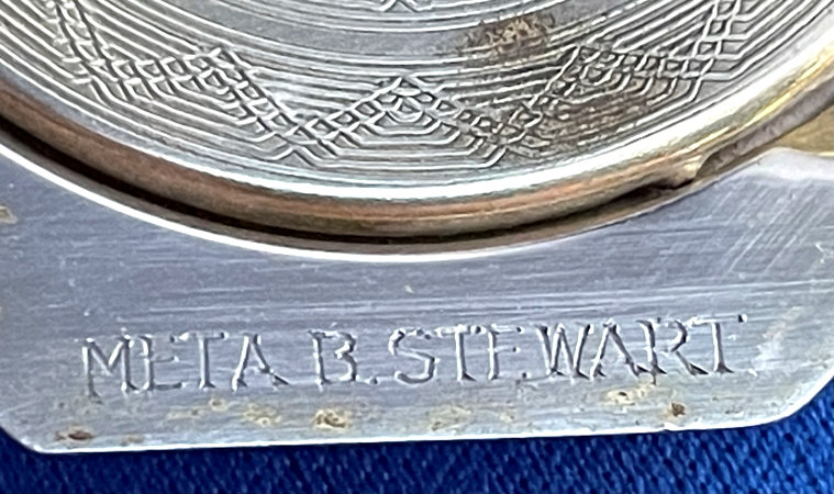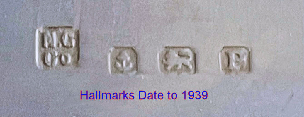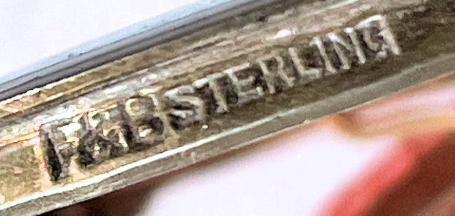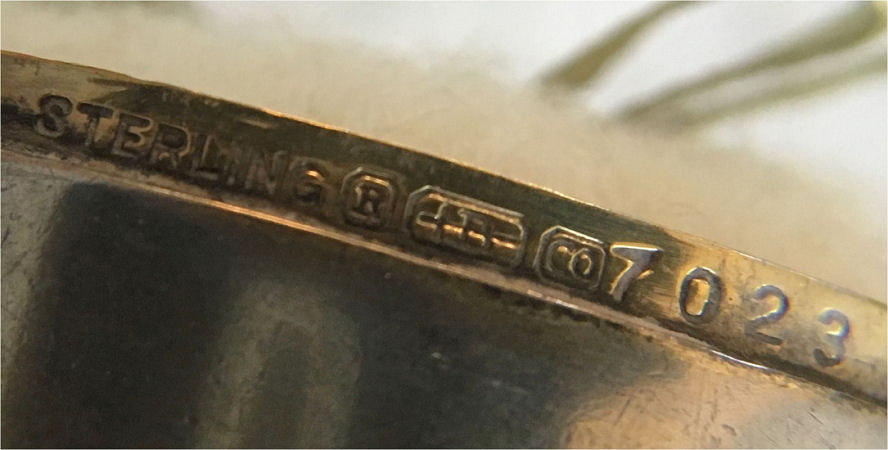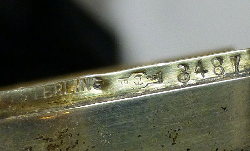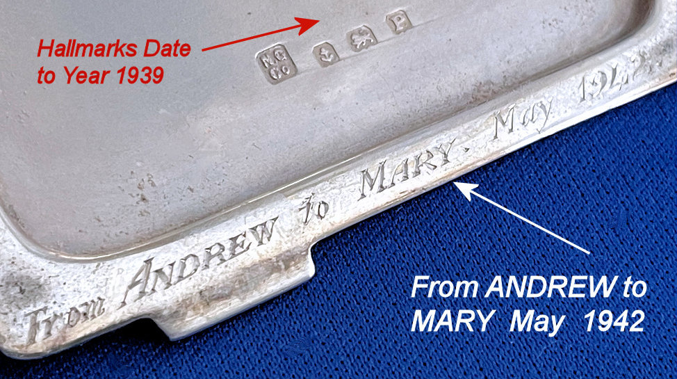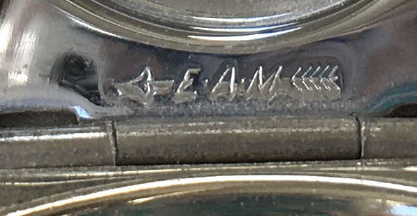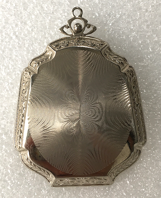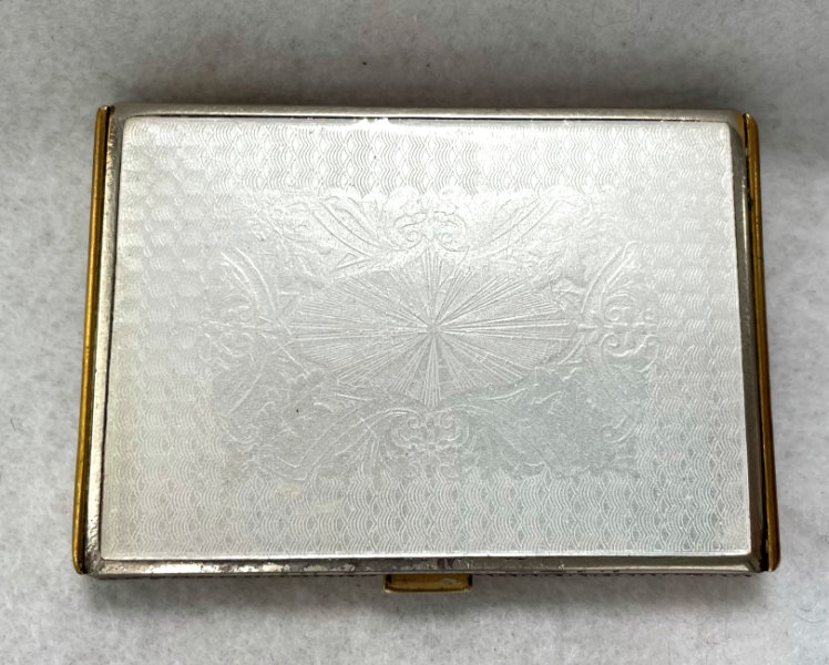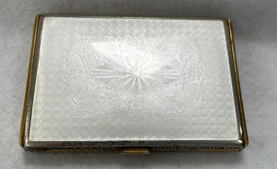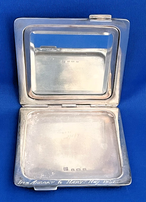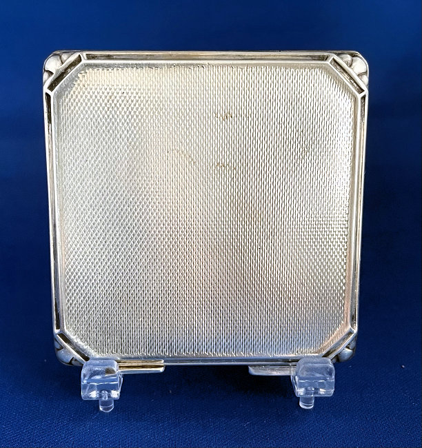 This has long been in my collection and had been stored away since 2002! I recently came across it and have decided to offer it here. It is a beautiful sterling silver compact with hallmarks from the Northern Goldsmiths & Silversmiths Co. of Birmingham, England. The hallmarks date this piece to 1939. The case is engraved around the perimeter and the entire surface is done in a snowy white enamel guilloche with radiating rays that glisten in the light. This is surrounded by a very thin border of of blue enamel inlaid in the engraved silver. The back is an engine-turned design. Inside you will find a full beveled mirror in the lid in excellent usable condition. The base has a powder screen over an open powder well. Inside the powder well you can find the hallmarks for the Northern G & S Co. and the date marks for Birmingham, 1939. What I love most about this compact, however, is the inscription on the lower edge "From ANDREW to MARY May 1942". I can't help but wonder ... was this a birthday gift? Engagement gift? Christmas gift? It could have been any of those things or something else entirely. I wonder where Mary and Andrew are now and wish I could find her to return her lovely compact to her. When I find inscriptions like this, my mind runs away with all the what ifs? Overall it is in excellent condition with virtually no scratches to the surface at all. There is, however, a flake in the clearcoat along the lower right side edge that is visible in the photos but in person you would never notice it. The back has a few darker spots in the silver ... very faint but I need to point out. Measures 2-5/8" square. (Click on pic for more photos.) |