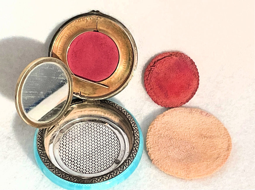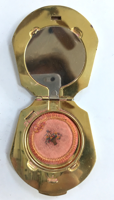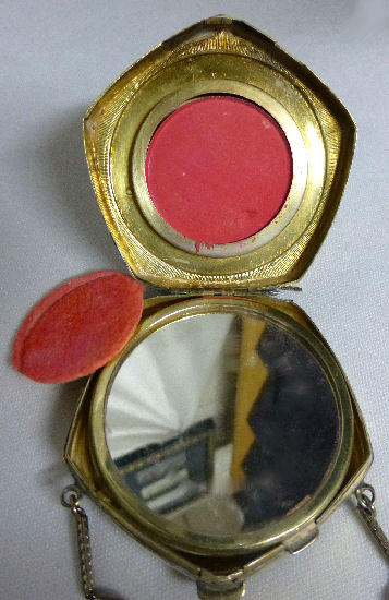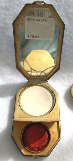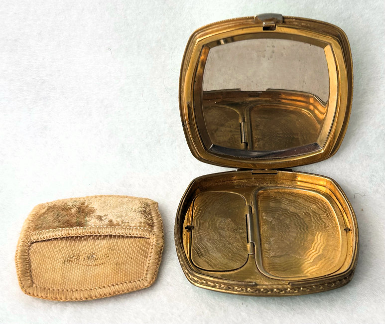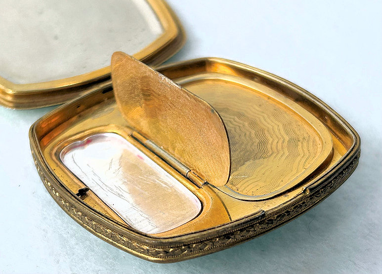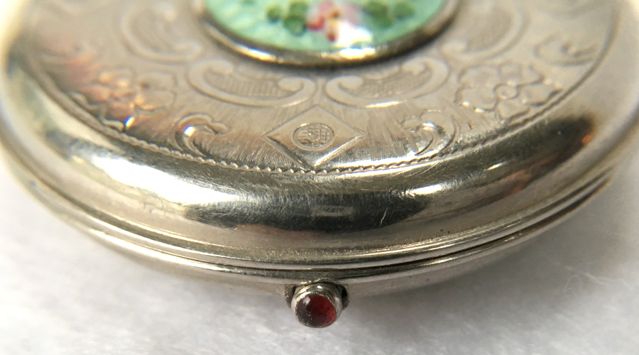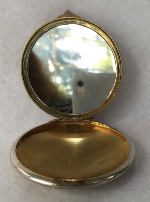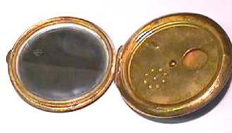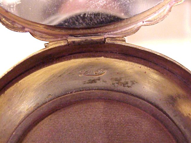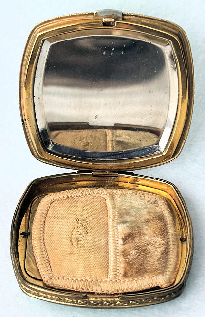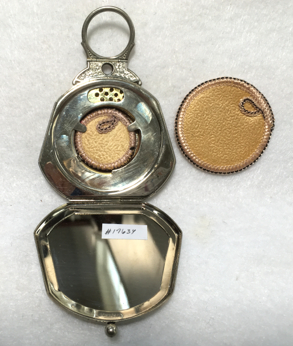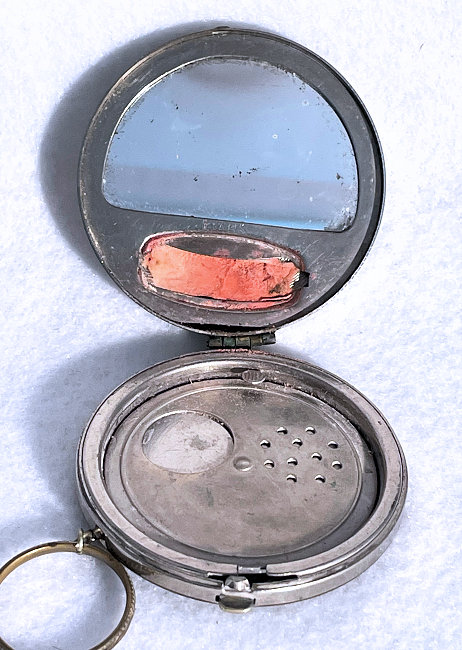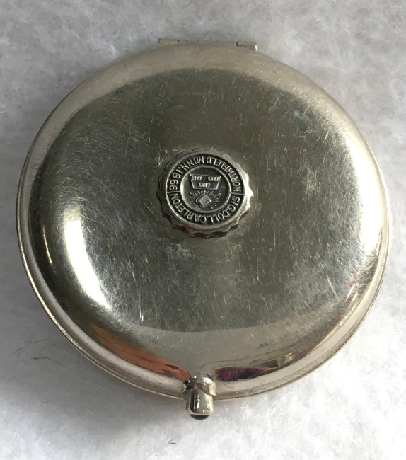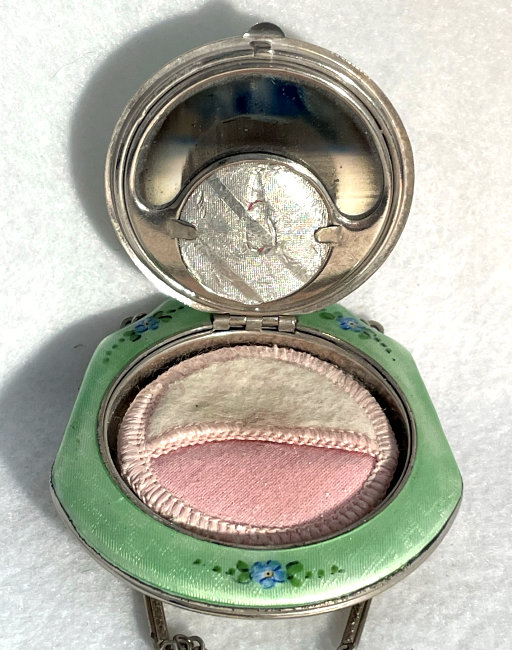 I wish I knew the story behind this precious little compact. I have never seen another one even remotely like it ... the size is tiny being only a tad over 1-1/2" diameter. The lid is all engraved with flowers and curlicues and has a center vignette with handpainted pink flowers on a pale green enamel guilloche background. Inside is a crescent mirror and rouge pot in the lid and a powder pot in the base with original nesting puffs. I have never come across this type of puff either! The compact latches shut tightly with a push-button ruby jewel. But what makes it interesting is the insignia on the bottom. It is a tiny round button which reads "SIG. COLL. CARLETON NORTHFIELD MINN 1866" with what appears to be books or some symbol for education. There are no other marks on the piece. Both rouge pot and powder pots are intact. Note: When closing the lid, it will not stay shut. The way it works is you have to push the gemstone in, close the lid, and release. It then locks into place and stays firmly closed. Again, never saw one like this! (Click on pic for more photos.) |
