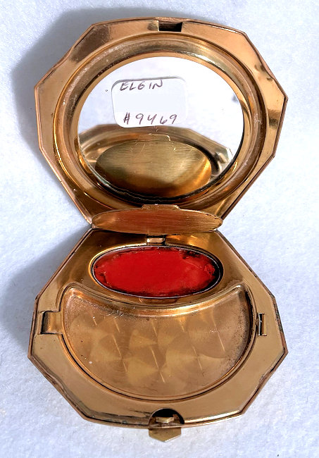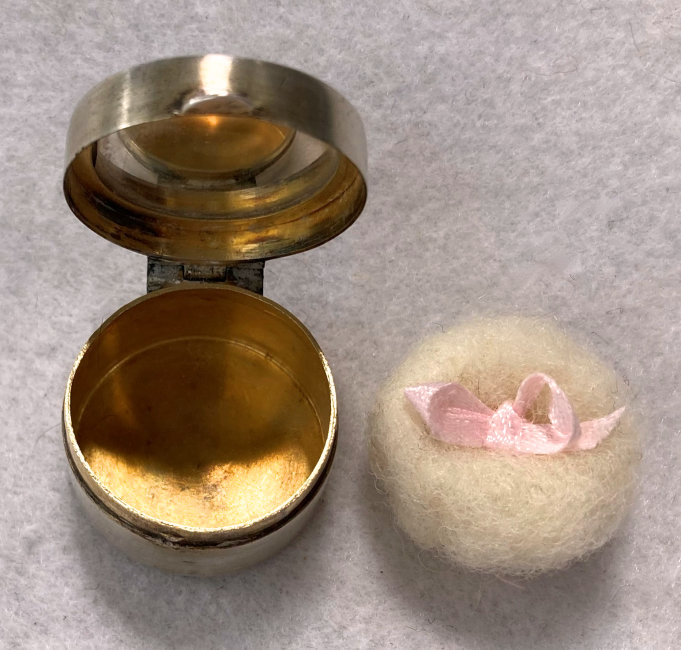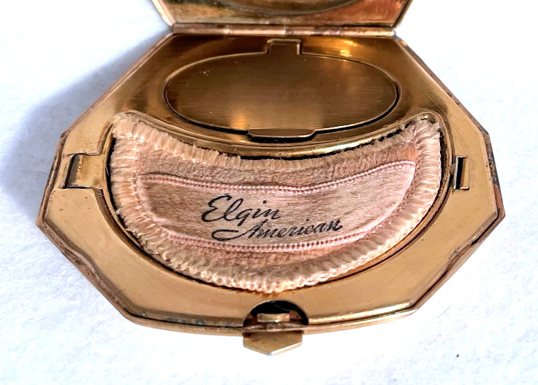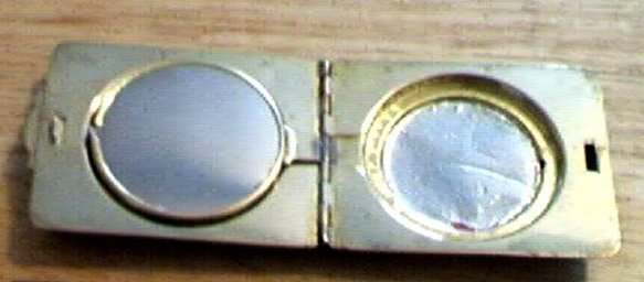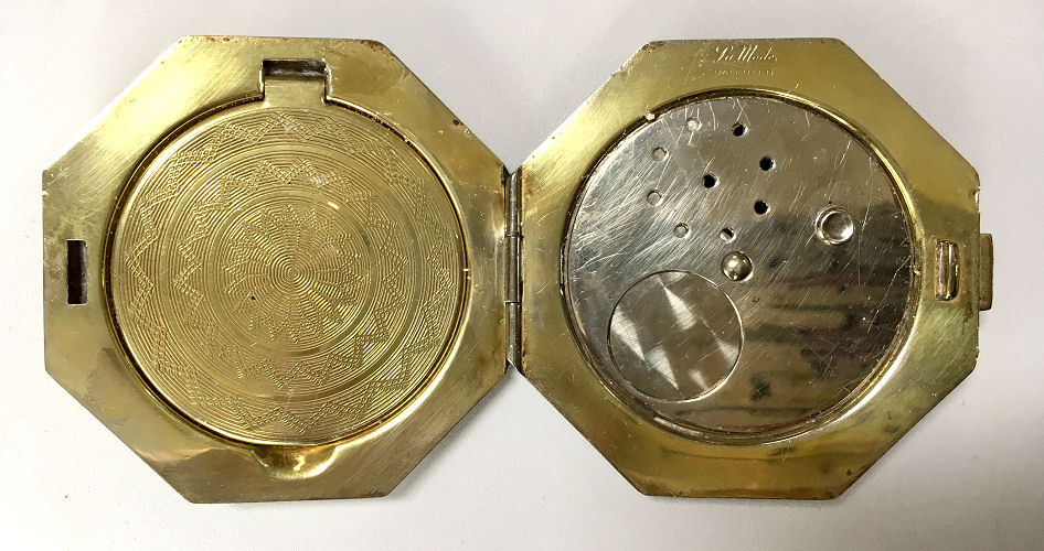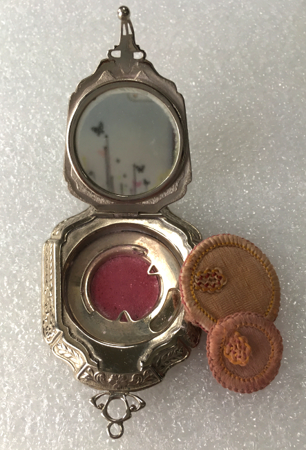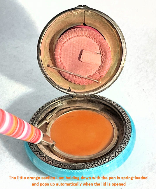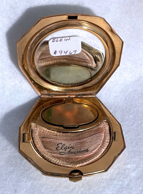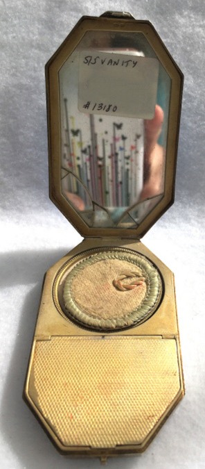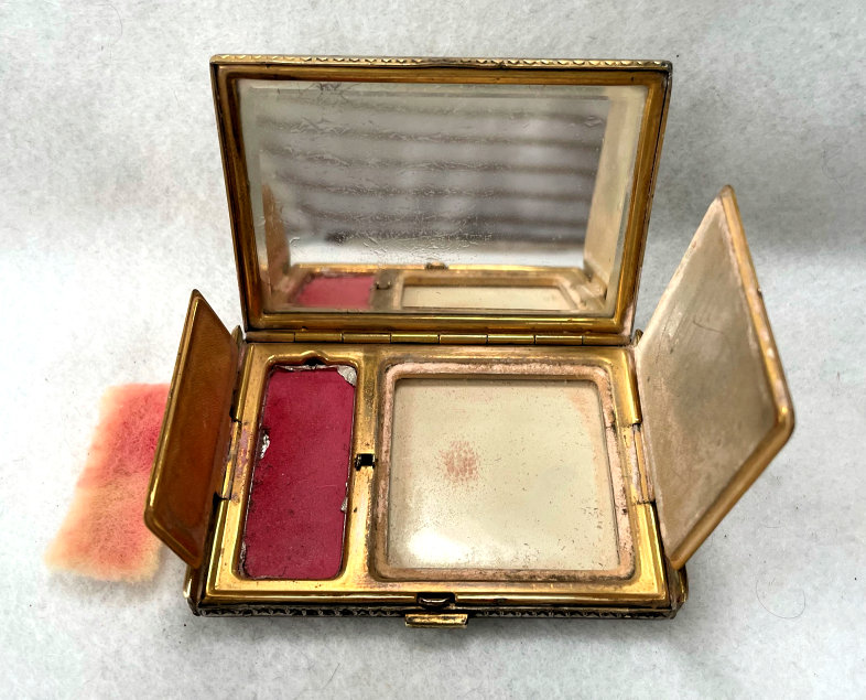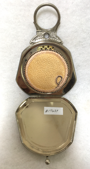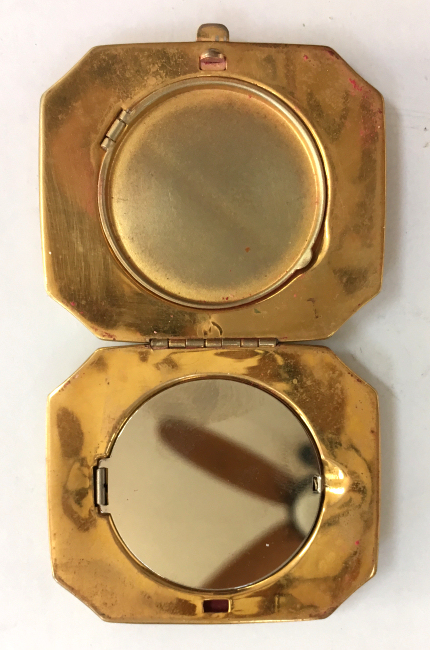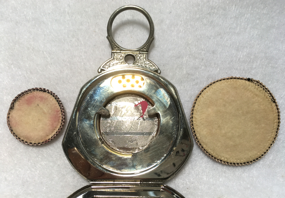 I wish I knew the story behind this precious little compact. I have never seen another one even remotely like it ... the size is tiny being only a tad over 1-1/2" diameter. The lid is all engraved with flowers and curlicues and has a center vignette with handpainted pink flowers on a pale green enamel guilloche background. Inside is a crescent mirror and rouge pot in the lid and a powder pot in the base with original nesting puffs. I have never come across this type of puff either! The compact latches shut tightly with a push-button ruby jewel. But what makes it interesting is the insignia on the bottom. It is a tiny round button which reads "SIG. COLL. CARLETON NORTHFIELD MINN 1866" with what appears to be books or some symbol for education. There are no other marks on the piece. Both rouge pot and powder pots are intact. Note: When closing the lid, it will not stay shut. The way it works is you have to push the gemstone in, close the lid, and release. It then locks into place and stays firmly closed. Again, never saw one like this! (Click on pic for more photos.) |