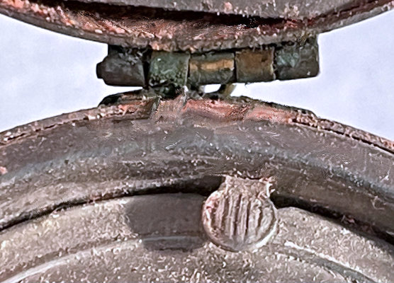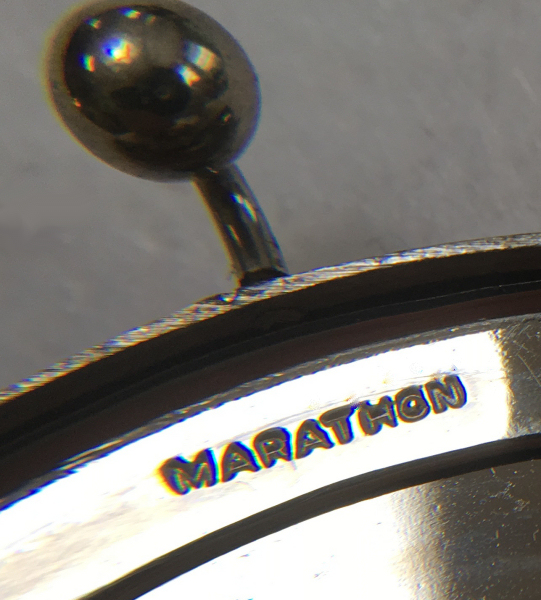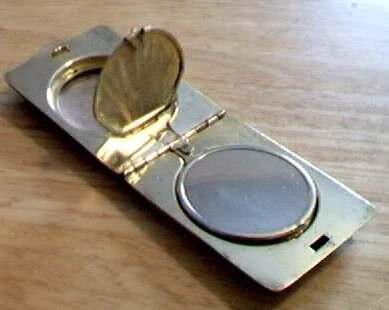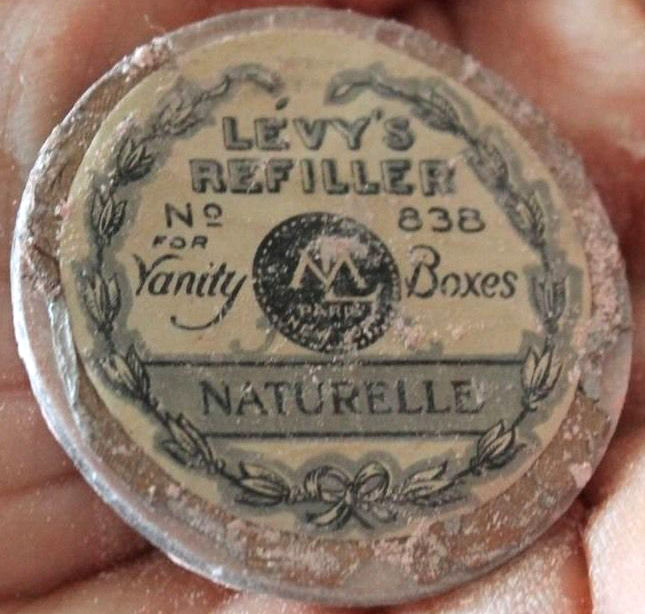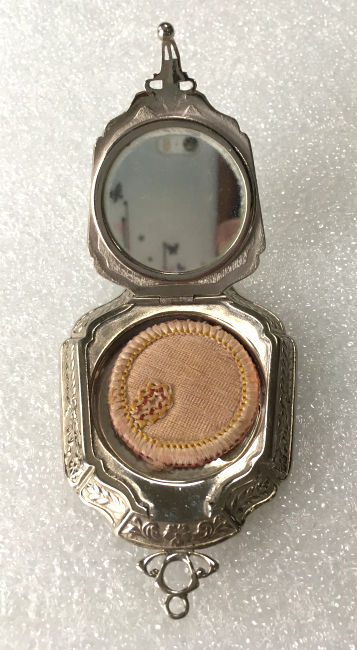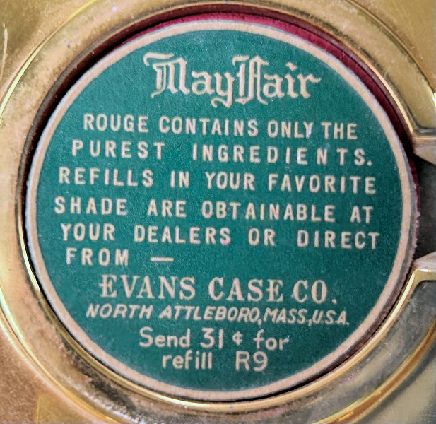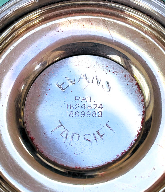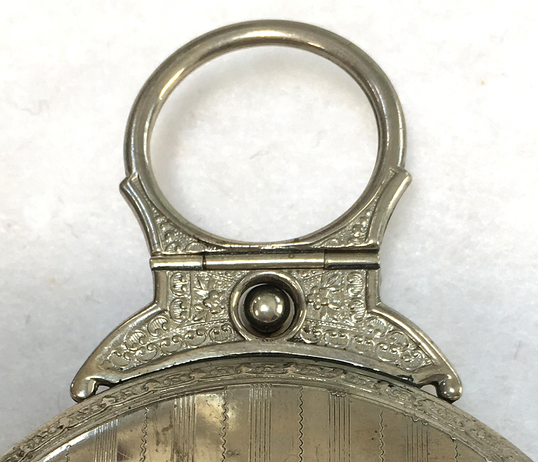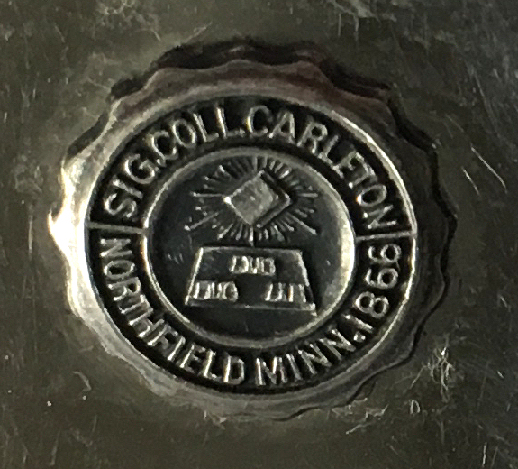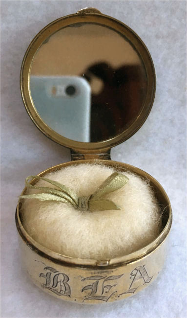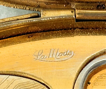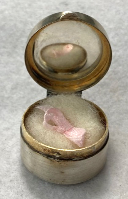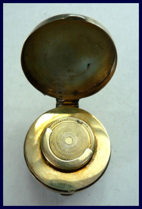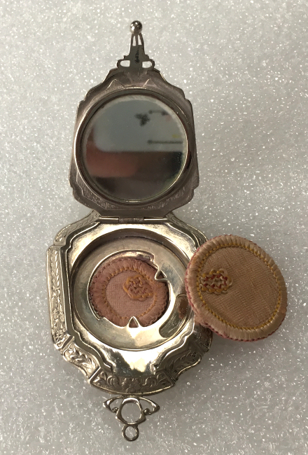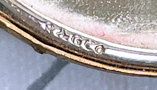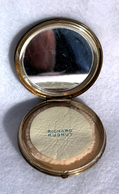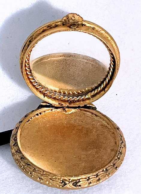 I wish I knew the story behind this precious little compact. I have never seen another one even remotely like it ... the size is tiny being only a tad over 1-1/2" diameter. The lid is all engraved with flowers and curlicues and has a center vignette with handpainted pink flowers on a pale green enamel guilloche background. Inside is a crescent mirror and rouge pot in the lid and a powder pot in the base with original nesting puffs. I have never come across this type of puff either! The compact latches shut tightly with a push-button ruby jewel. But what makes it interesting is the insignia on the bottom. It is a tiny round button which reads "SIG. COLL. CARLETON NORTHFIELD MINN 1866" with what appears to be books or some symbol for education. There are no other marks on the piece. Both rouge pot and powder pots are intact. Note: When closing the lid, it will not stay shut. The way it works is you have to push the gemstone in, close the lid, and release. It then locks into place and stays firmly closed. Again, never saw one like this! (Click on pic for more photos.) |