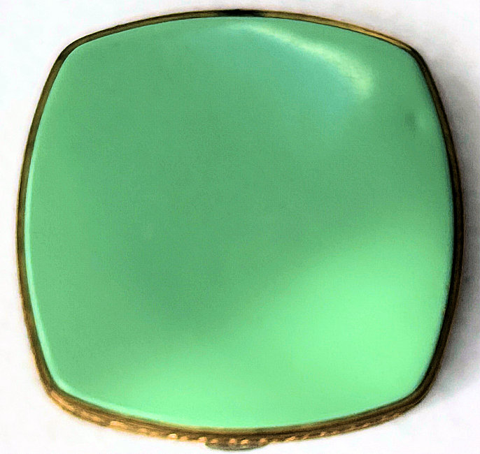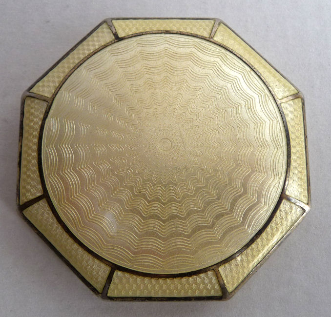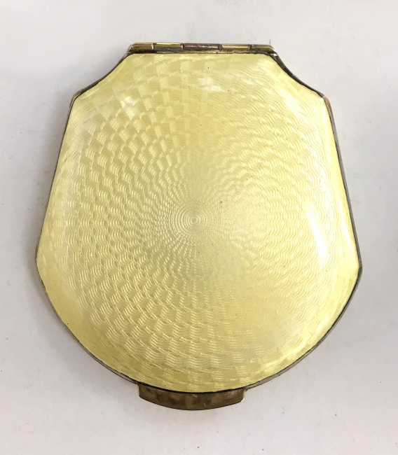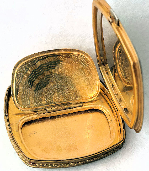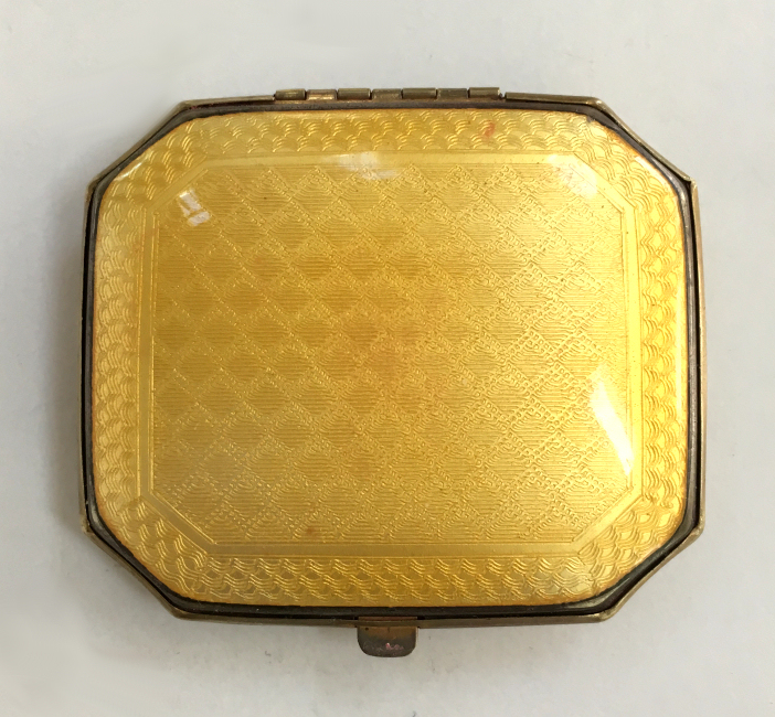 I love this darling little compact and its unique shape with the angled corners ... makes it so comfortable to hold in your hand. Both sides are done in a golden yellow enamel guilloche with difference designs in the guilloche patterns. The inside is all finished in a shiny bright gold gilt and has two covered compartments, a rouge and a powder with space for a small puff. The enamel is in excellent condition on both sides. It's just a great piece! Measures approximately 2-1/8" x 1-3/4". (Click on pic for more photos.) |