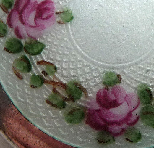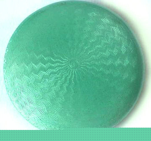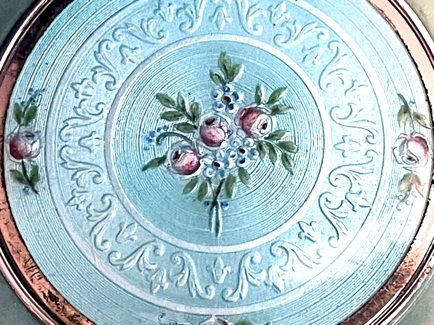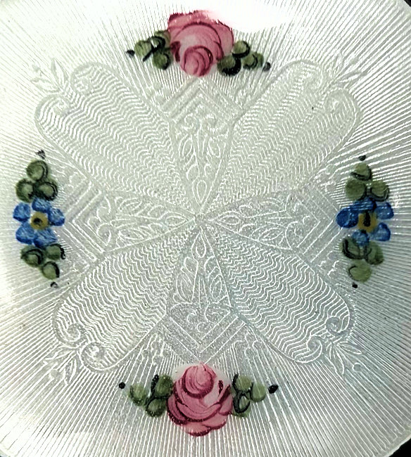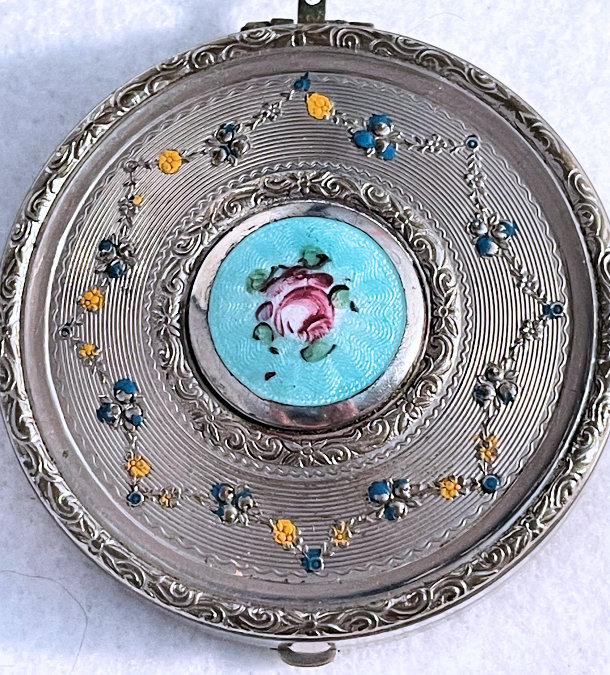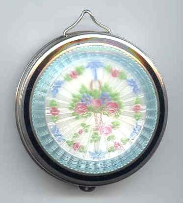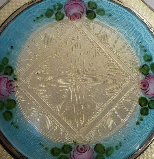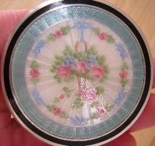 Soft and feminine is what I think of when I look at this beautiful compact done in an ivory shade of enamel guilloche in champleve on both the front and back of the body. The lid is composed of the same ivory shade with a really pretty design in the guilloche surrounded by aqua blue with pink roses. It is just so pretty! Inside the compact is a lid in the mirror and a rotating powder sifter in the base. There are no markings of any kind on the compact that I can find. I don't believe the base metal is sterling but I think it does have some silver content. Excellent condition throughout ... no scuffs on the enamel that I can see at all. Measures 2-1/8" diameter. (Click on pic for more photos.) |