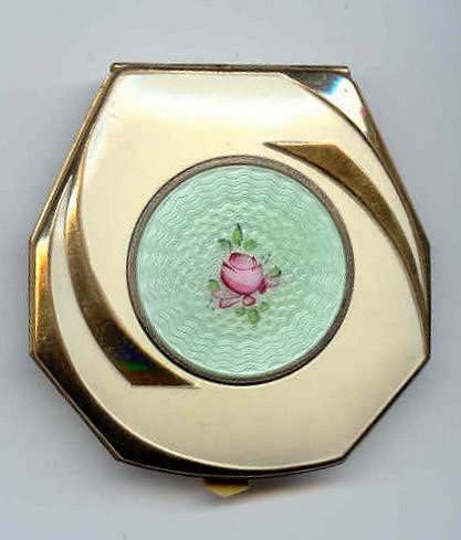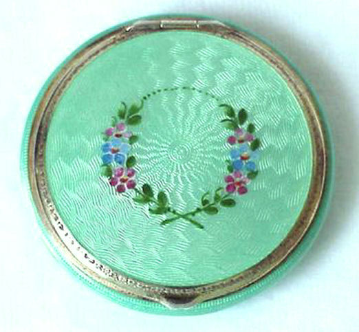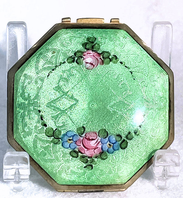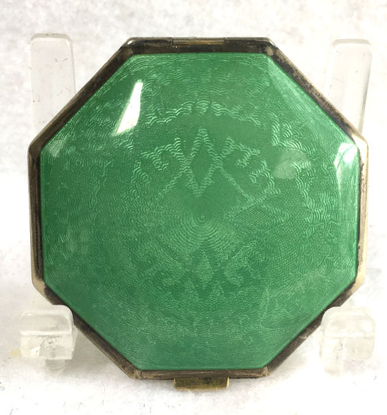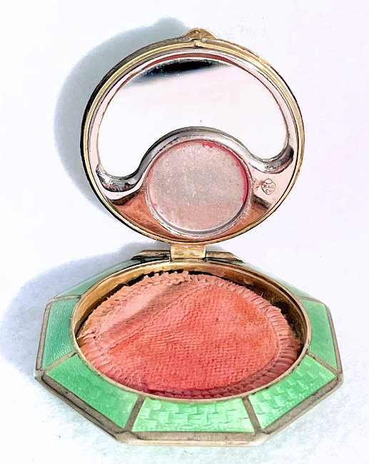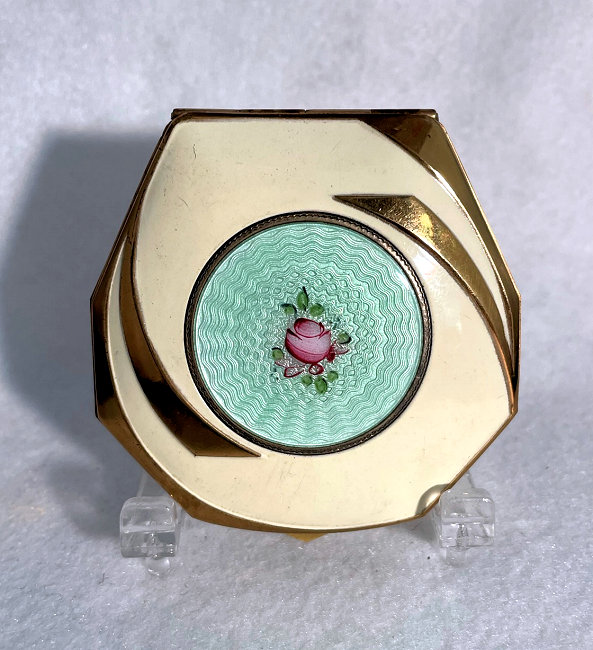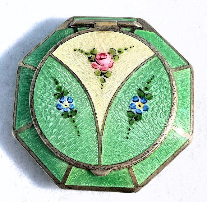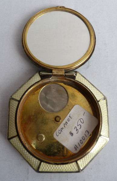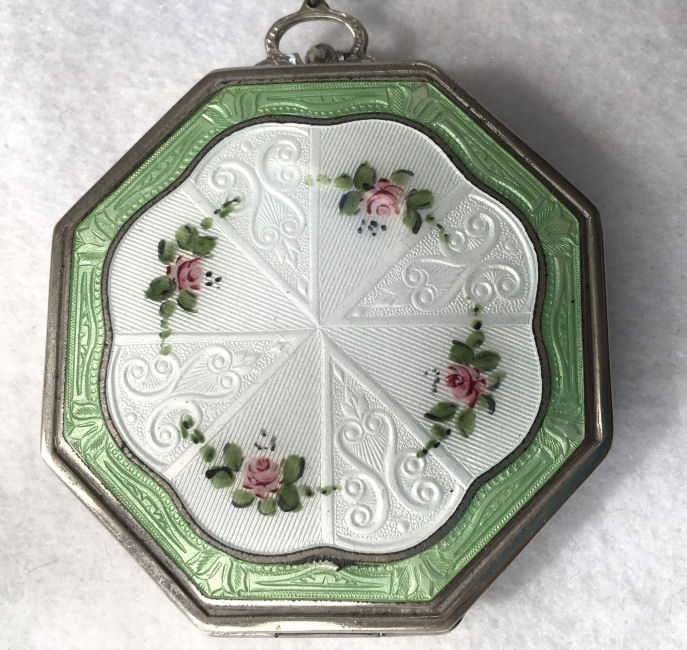 This is a stunning little compact made by R & G Co. with a very unusual design to the enamel guilloche. The lid is done in three sections divided by silver curved inlays. The guilloche design is different on the green sections than the ivory and they all have hand-painted flowers in each segment. The compact itself is octagon shaped again with silver dividing the sections of enameling. This design is repeated on the back but without the lid design. It is very pretty. Inside you will find a crescent-shaped mirror in the lid which is in excellent shape with a rouge pot beneath and a rotating powder sifter in the base with an original puff. The compact snaps together tightly. Overall it is in excellent condition. Measures 2" diameter. (Click on pic for more photos.) |
