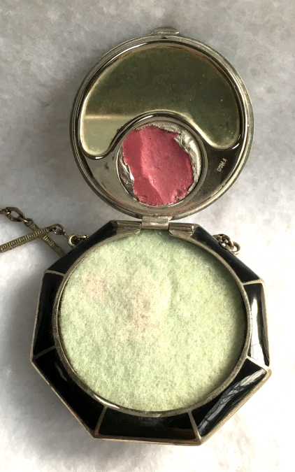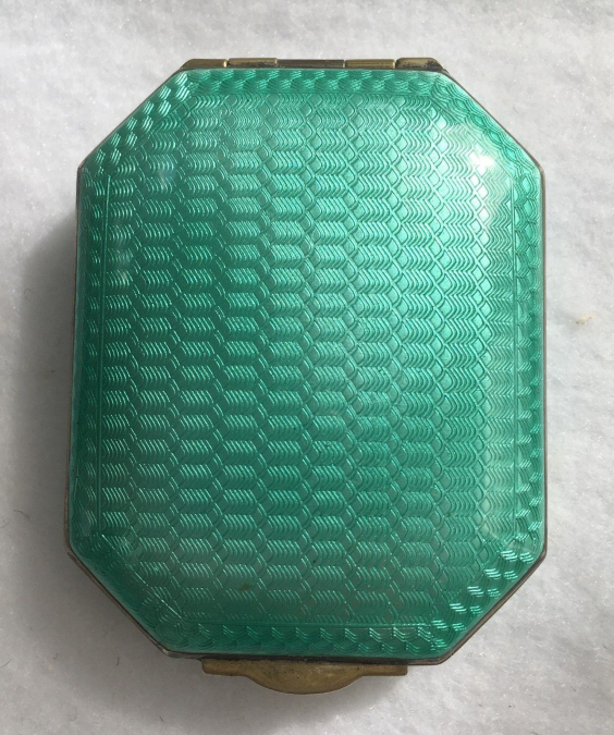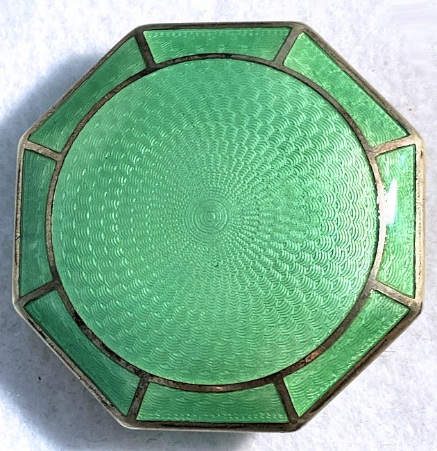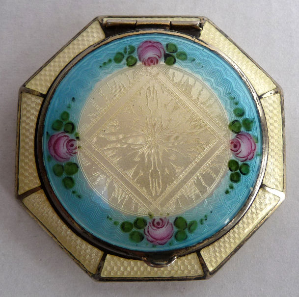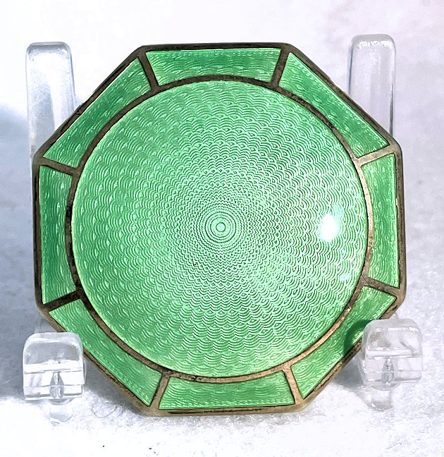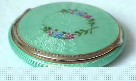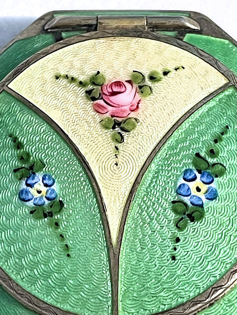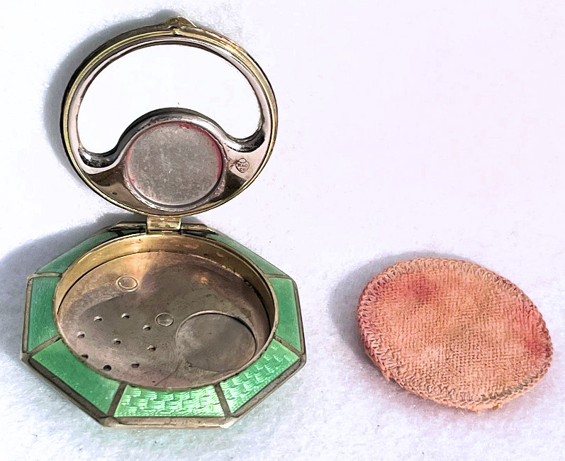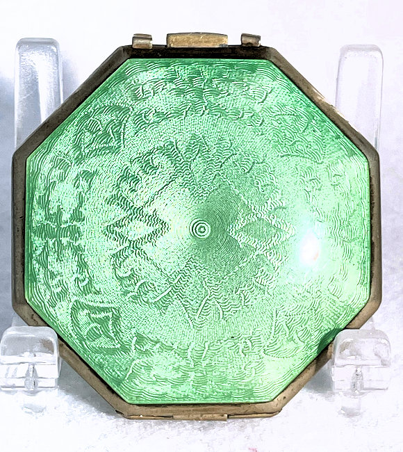 This is a stunning little compact made by R & G Co. with a very unusual design to the enamel guilloche. The lid is done in three sections divided by silver curved inlays. The guilloche design is different on the green sections than the ivory and they all have hand-painted flowers in each segment. The compact itself is octagon shaped again with silver dividing the sections of enameling. This design is repeated on the back but without the lid design. It is very pretty. Inside you will find a crescent-shaped mirror in the lid which is in excellent shape with a rouge pot beneath and a rotating powder sifter in the base with an original puff. The compact snaps together tightly. Overall it is in excellent condition. Measures 2" diameter. (Click on pic for more photos.) |
